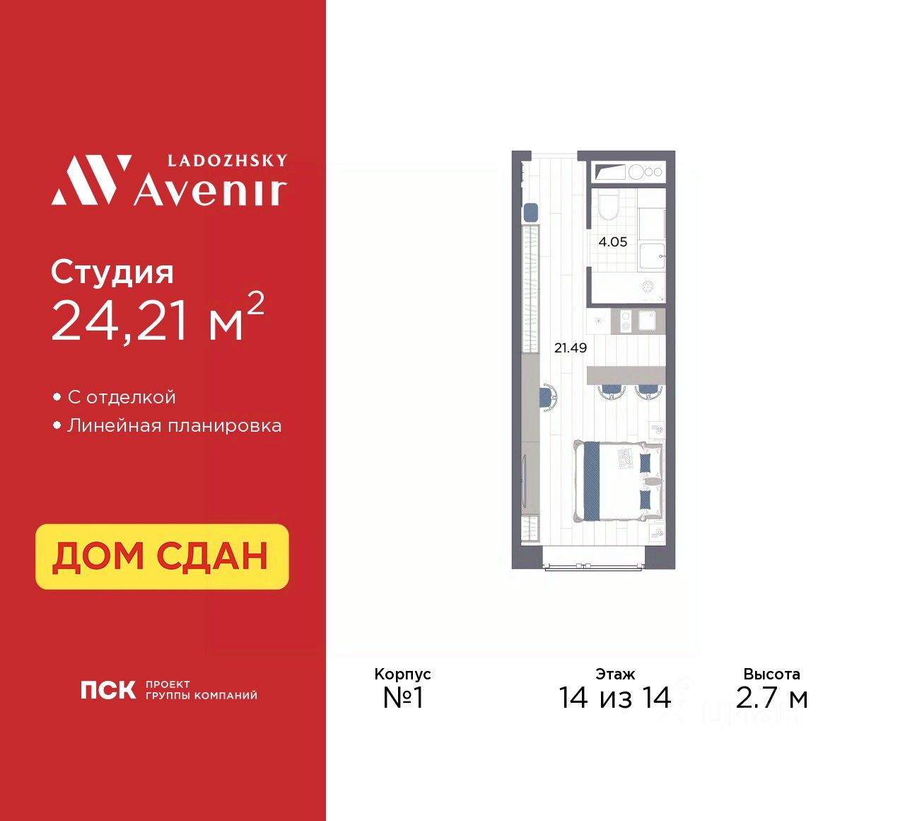 Однокомнатные апартаменты-студия от застройщика с отделкой в ЖК ''Ladozhsky AVENIR'' на 14 этаже. Общая площадь: 24.21 кв.м., площадь гостиной 21.49 кв.м., из которых 5 кв.м. выделено под кухонную зону. Все окна выходят на одну сторону. В апартаментах один совмещенный санузел. Высота потолков 2.7 м.
