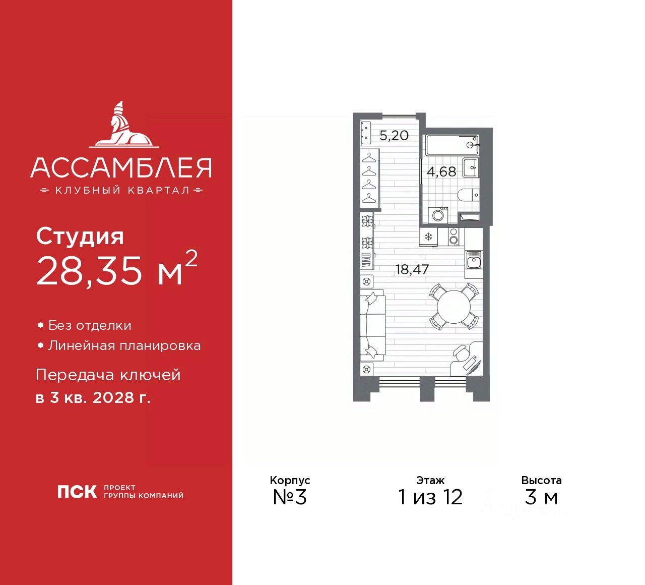 Просторная 1-комн. квартира-студия в Клубный квартал ''Ассамблея'' на 1 этаже. Квартира без отделки, полностью готова к чистовой отделке и дальнейшему ремонту. Общая площадь: 28.35 кв.м., площадь гостиной 18.47 кв.м., из которых 5 кв.м. выделено под кухонную зону. Все окна выходят на одну сторону. В квартире один совмещенный санузел. Высота потолков 3 м.