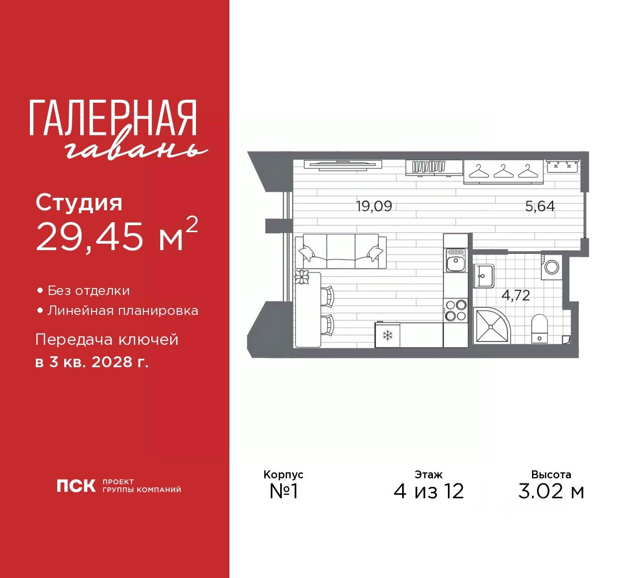Однокомнатная квартира-студия в ЖК ''Галерная гавань'' на 4 этаже. Квартира без отделки, после получения ключей можно делать ремонт. Общая площадь: 29.45 кв.м., площадь гостиной 19.09 кв.м., из которых 5 кв.м. выделено под кухонную зону. Все окна выходят на одну сторону. В квартире один совмещенный санузел. Высота потолков 3.02 м.