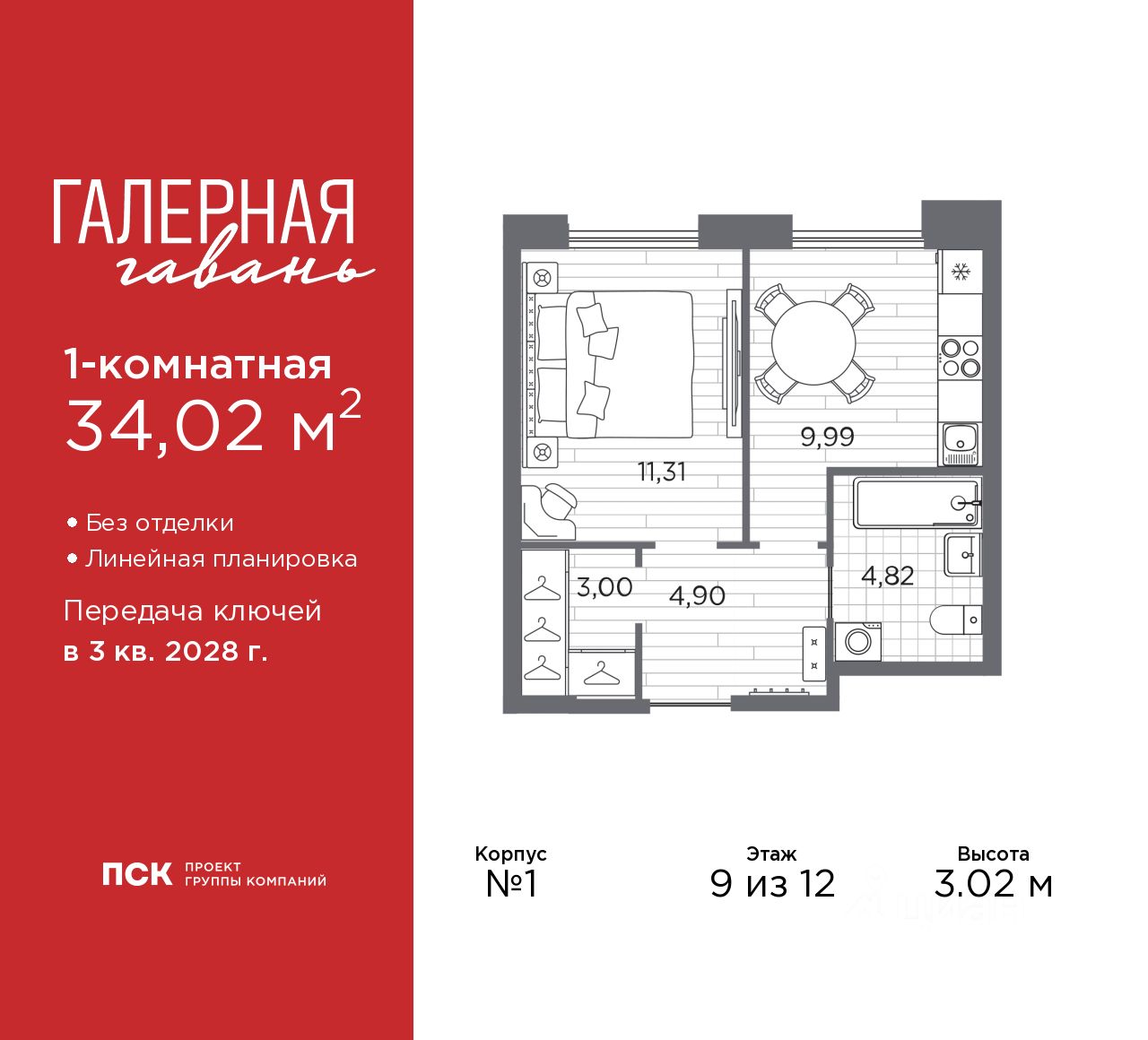 1-комн. квартира в ЖК ''Галерная гавань'' на 9 этаже. Квартира без отделки, после получения ключей можно делать ремонт. Общая площадь: 34.02 кв.м., жилая: 11.31 кв.м., площадь просторной кухни-столовой: 9.99 кв.м. Все окна выходят на одну сторону. В квартире один совмещенный санузел. Высота потолков 3.02 м.