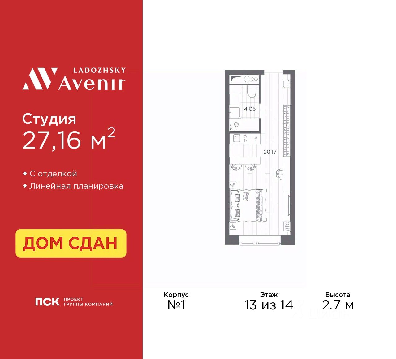 1-комн. апартаменты-студия с отделкой в ЖК ''Ladozhsky AVENIR'' на 13 этаже. Общая площадь: 27.16 кв.м., площадь гостиной 23.11 кв.м., из которых 5 кв.м. выделено под кухонную зону. Все окна выходят на одну сторону. В апартаментах один совмещенный санузел. Высота потолков 2.7 м.