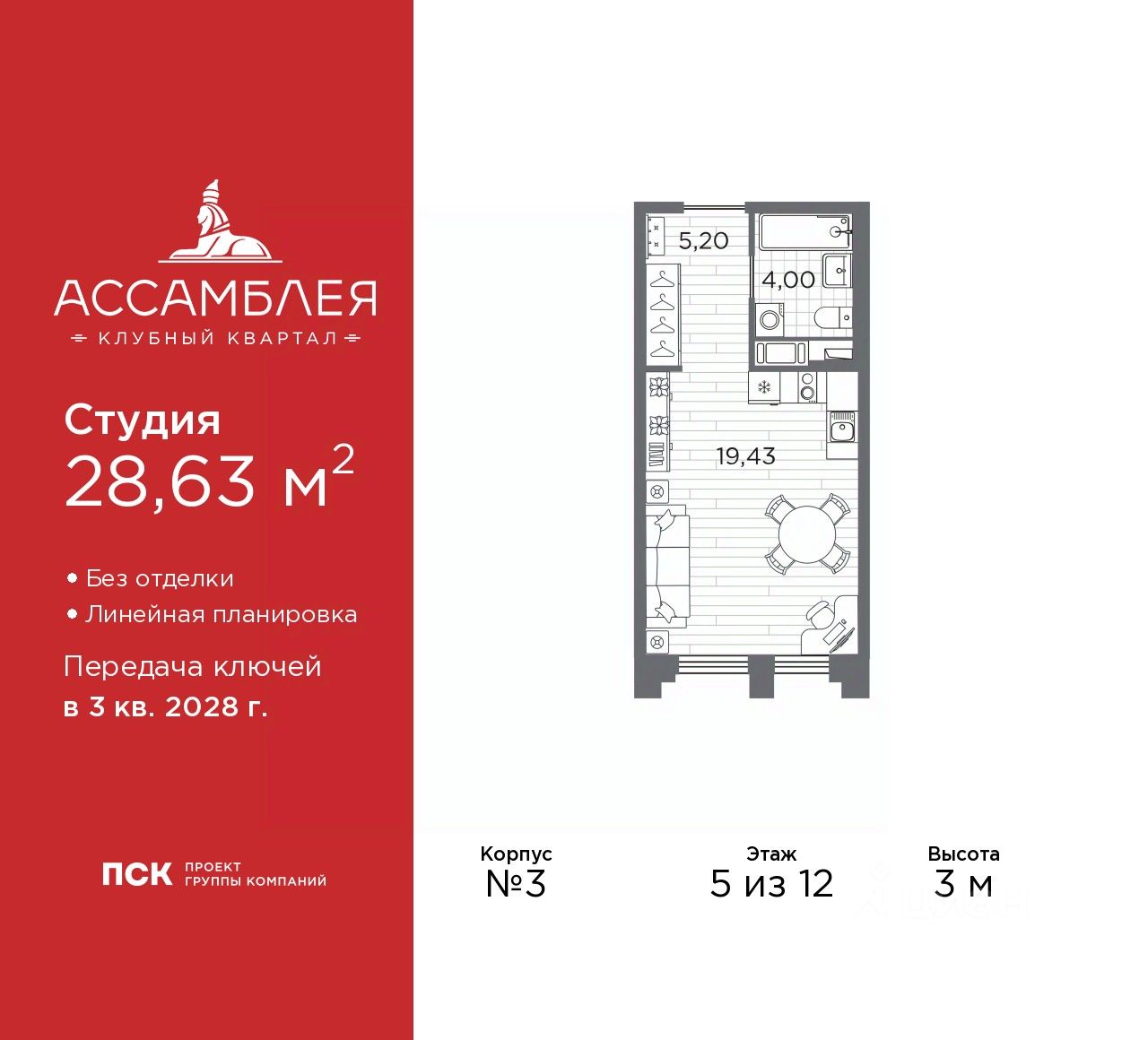 1-комн. квартира-студия в Клубный квартал ''Ассамблея'' на 5 этаже. Квартира без отделки, полностью готова к ремонту. Общая площадь: 28.63 кв.м., площадь гостиной 19.43 кв.м., из которых 5 кв.м. выделено под кухонную зону. Все окна выходят на одну сторону. В квартире один совмещенный санузел. Высота потолков 3 м.