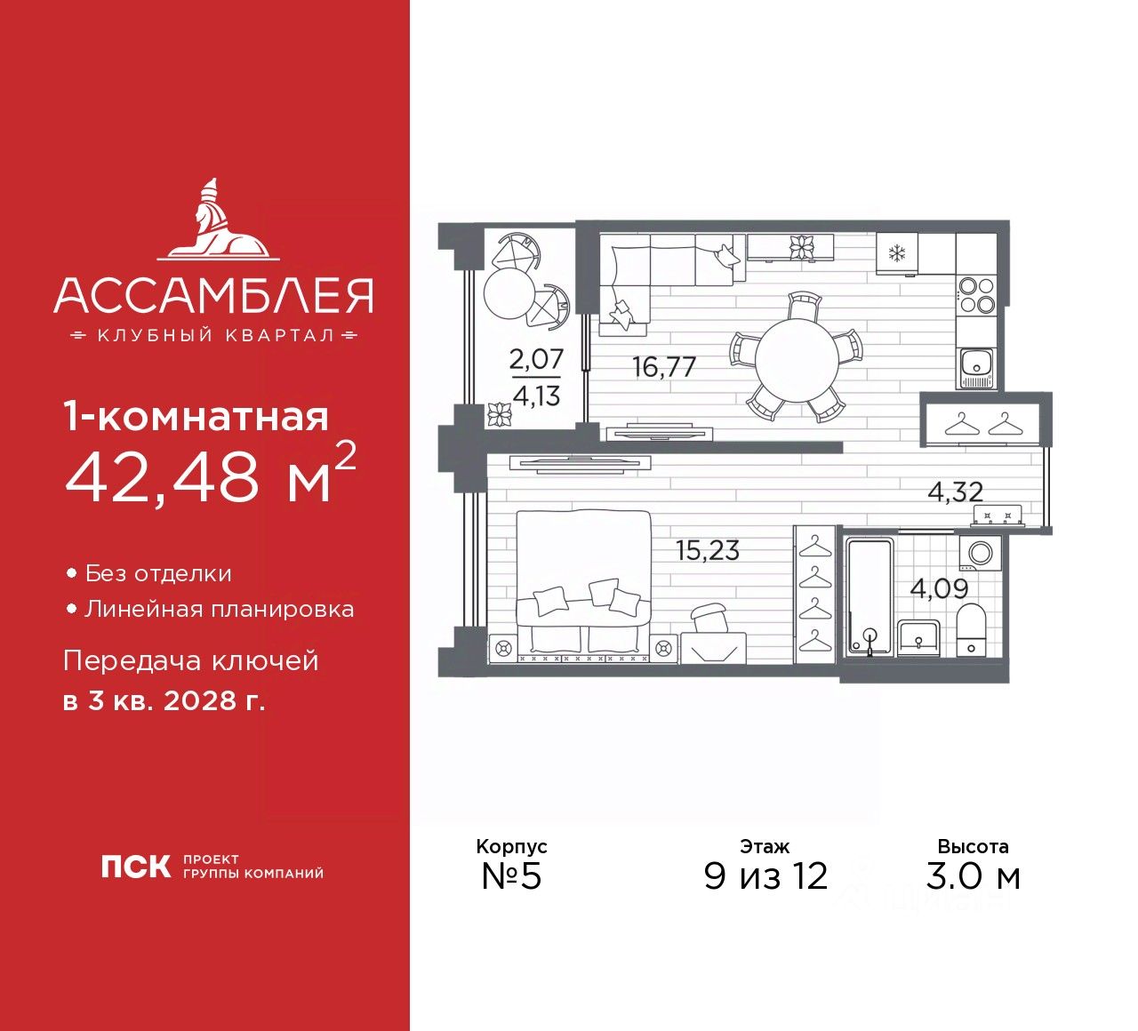 Просторная однокомнатная квартира в Клубный квартал ''Ассамблея'' на 9 этаже. Квартира без отделки, полностью готова к ремонту. Общая площадь: 42.48 кв.м., жилая: 15.23 кв.м., площадь просторной кухни-столовой: 16.77 кв.м. Все окна выходят на одну сторону. В квартире одна лоджия, один совмещенный санузел. Высота потолков 3.0 м.