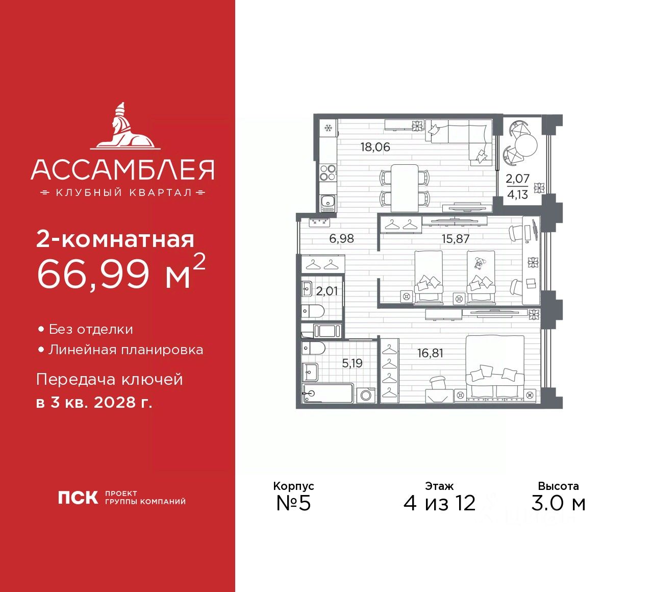 Двухкомнатная квартира от застройщика в Клубный квартал ''Ассамблея'' на 4 этаже. Квартира без отделки, после оформления собственности можно делать ремонт. Общая площадь: 66.99 кв.м., жилая: 32.68 кв.м., площадь просторной кухни-столовой: 18.06 кв.м. Комнаты изолированные, все окна выходят на одну сторону. В квартире одна лоджия, один совмещенный и один раздельный санузел. Высота потолков 3.0 м.