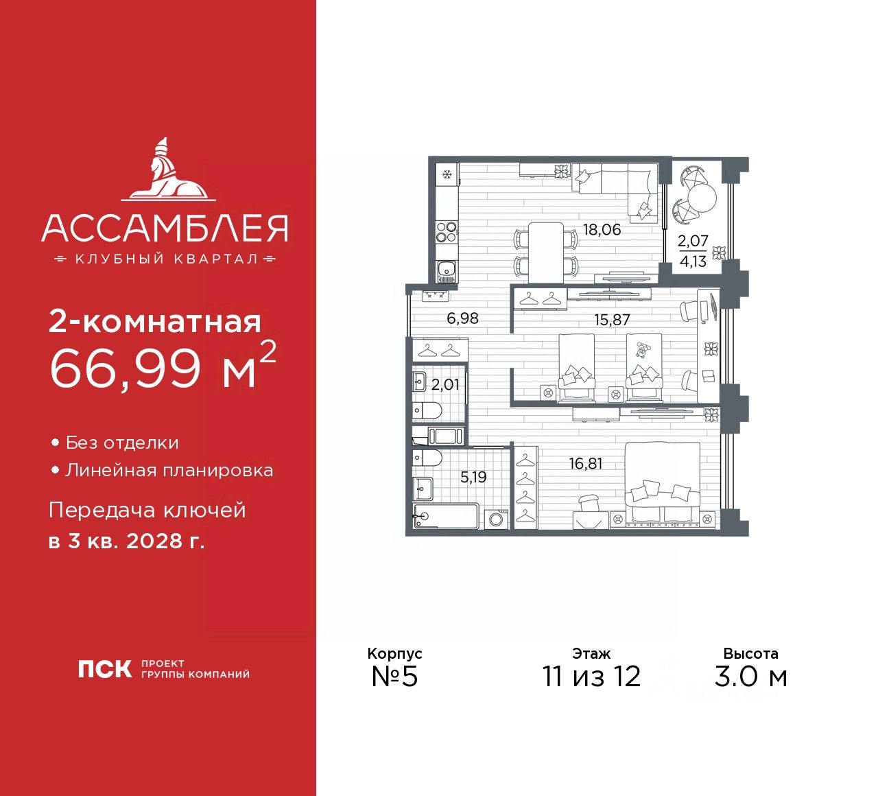 2-комн. квартира от застройщика в Клубный квартал ''Ассамблея'' на 11 этаже. Квартира без отделки, новый собственник может сделать ремонт по своему дизайн-проекту. Общая площадь: 66.99 кв.м., жилая: 32.68 кв.м., площадь просторной кухни-столовой: 18.06 кв.м. Комнаты изолированные, все окна выходят на одну сторону. В квартире одна лоджия, один совмещенный и один раздельный санузел. Высота потолков 3.0 м.