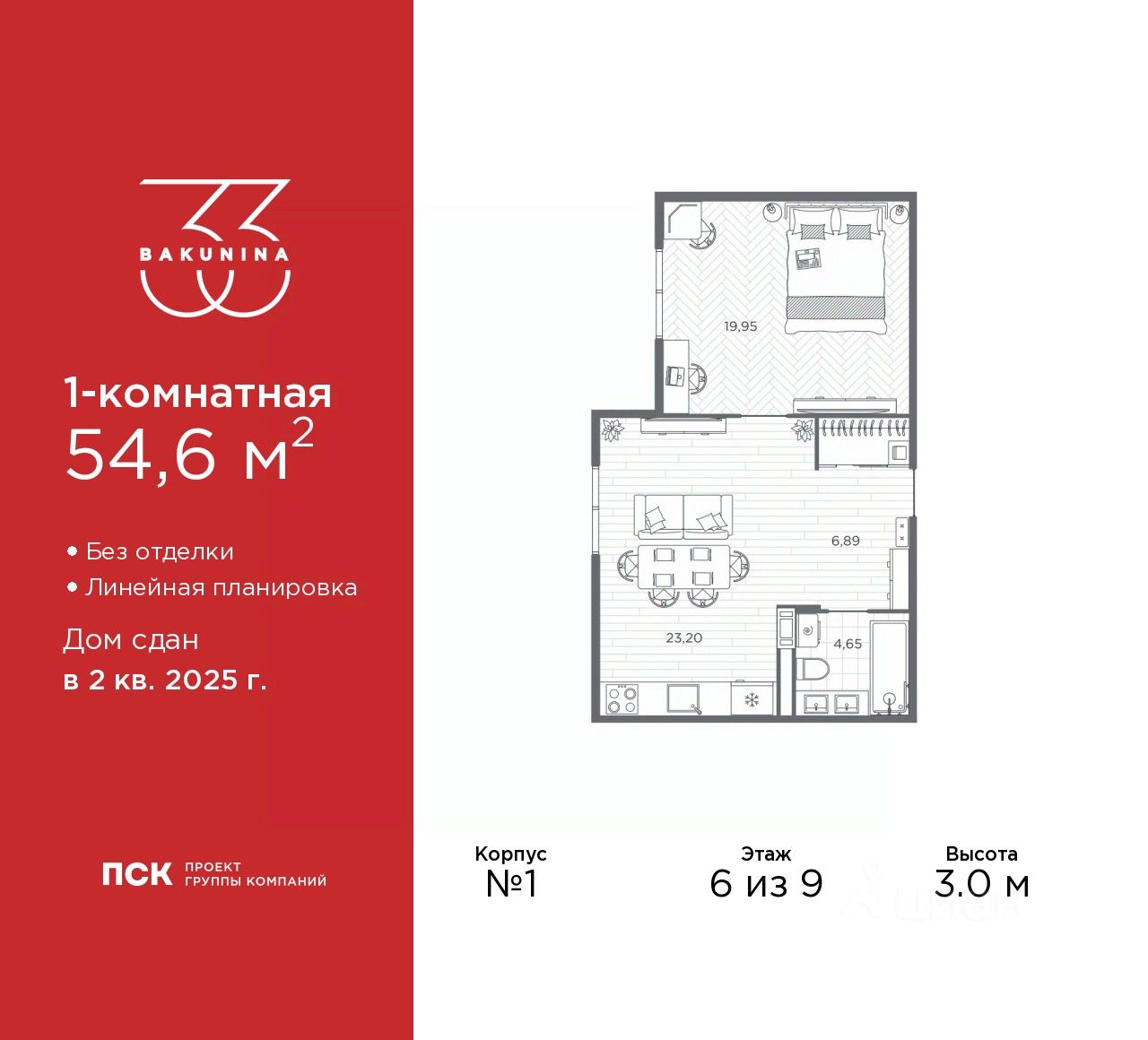 1-комн. квартира от застройщика в ЖК ''BAKUNINA 33'' на 6 этаже. Квартира без отделки, полностью готова к ремонту. Общая площадь: 54.6 кв.м., жилая: 19.95 кв.м., площадь просторной кухни-столовой: 23.2 кв.м. Все окна выходят на одну сторону. В квартире один совмещенный санузел. Высота потолков 3.0 м.