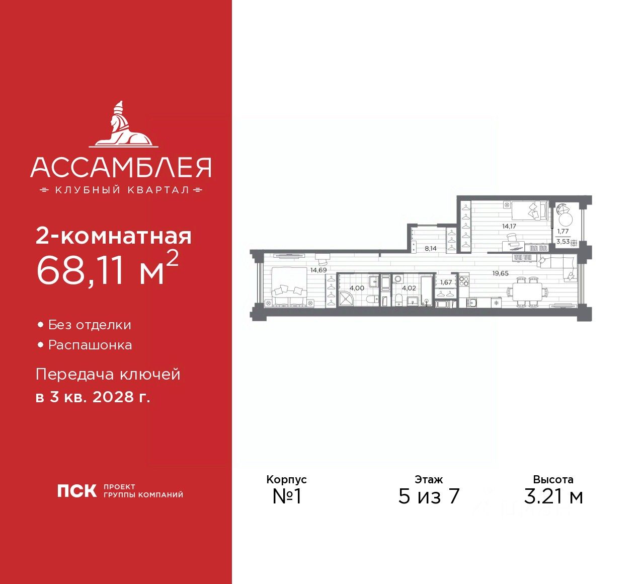 2-комн. квартира от застройщика в Клубный квартал ''Ассамблея'' на 5 этаже. Квартира без отделки, после выдачи ключей можно делать ремонт. Общая площадь: 68.11 кв.м., жилая: 28.86 кв.м., площадь просторной кухни-столовой: 19.65 кв.м. Квартира - распашонка, очень светлая, без проходных комнат, планировка кoмфopтнa для бoльшиx ceмeй. В квартире одна лоджия, два совмещенных санузла. Высота потолков 3.21 м.