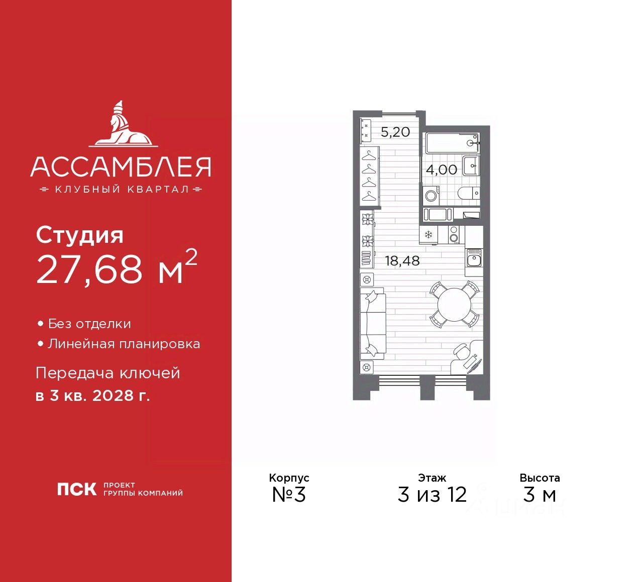 1-комн. квартира-студия в Клубный квартал ''Ассамблея'' на 3 этаже. Квартира без отделки, после оформления собственности можно делать ремонт. Общая площадь: 27.68 кв.м., площадь гостиной 18.48 кв.м., из которых 5 кв.м. выделено под кухонную зону. Все окна выходят на одну сторону. В квартире один совмещенный санузел. Высота потолков 3 м.