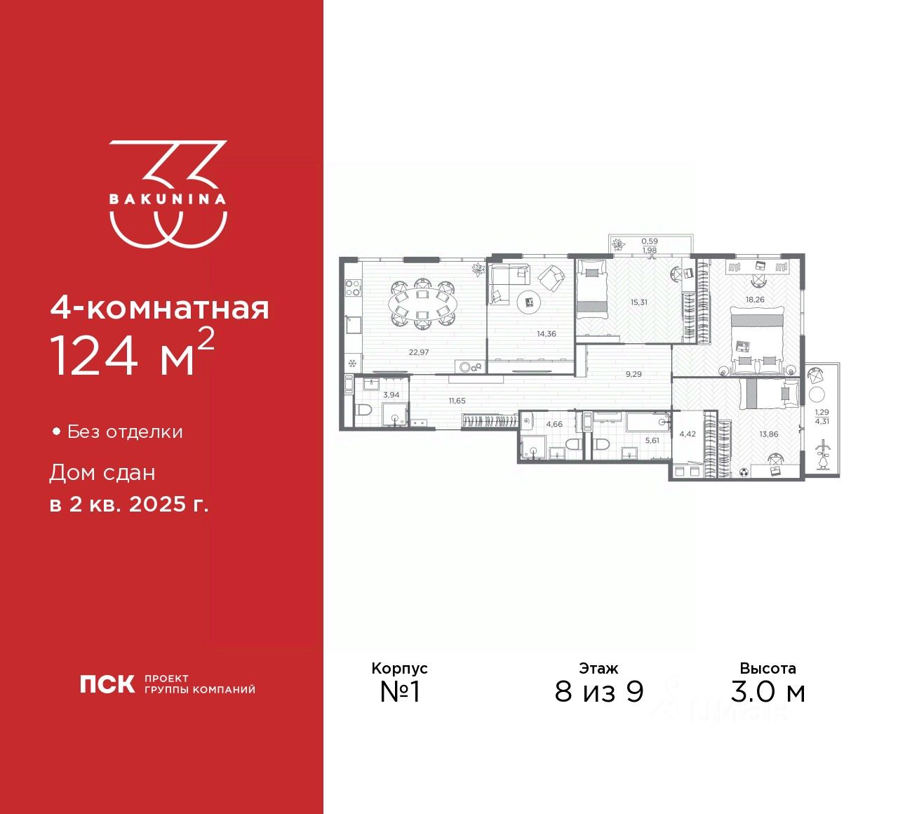 4-комн. квартира от застройщика в ЖК ''BAKUNINA 33'' на 8 этаже. Квартира без отделки, полностью готова к чистовой отделке и дальнейшему ремонту. Общая площадь: 124 кв.м., жилая: 61.79 кв.м., площадь просторной кухни-столовой: 22.97 кв.м. Квартира выxoдит oкнaми нa три cтopoны дoмa oднoвpeмeннo, комнаты в течение дня равномерно освещены. В квартире два балкона, три совмещенных санузла. Высота потолков 3.0 м.