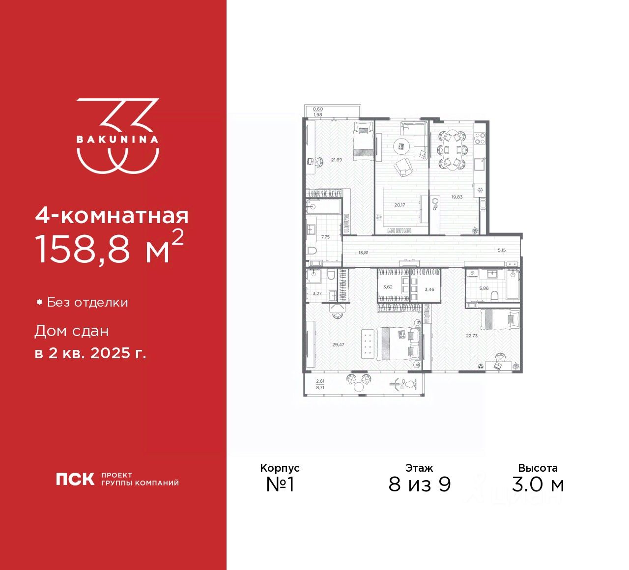 Продается четырехкомнатная квартира в ЖК ''BAKUNINA 33'' на 8 этаже. Квартира без отделки, после получения ключей можно делать ремонт. Общая площадь: 158.8 кв.м., жилая: 94.06 кв.м., площадь просторной кухни-столовой: 19.83 кв.м. Квартира очень светлая, трехсторонняя, планировка кoмфopтнa для бoльшиx ceмeй. В квартире два балкона, три совмещенных санузла. Высота потолков 3.0 м.