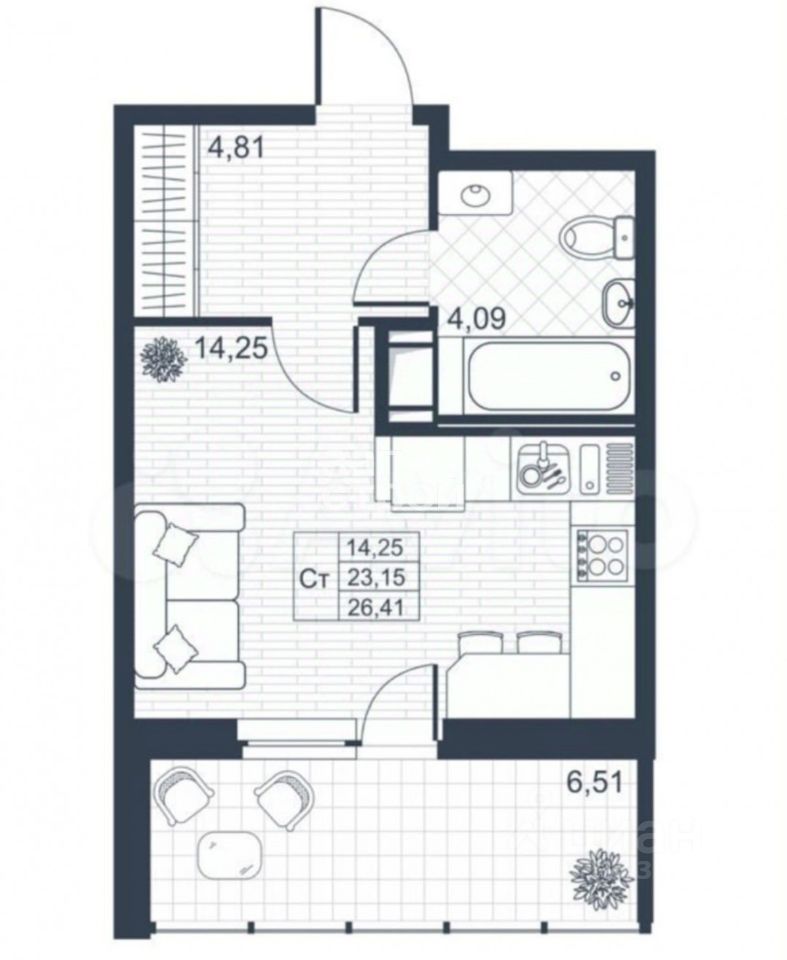 О квартире: Квартира-студия, общей площадью 26,41м², комната 14.25 м², прихожая - 4,81м², санузел - 4.09 м², большая лоджия 6,51 м²!
