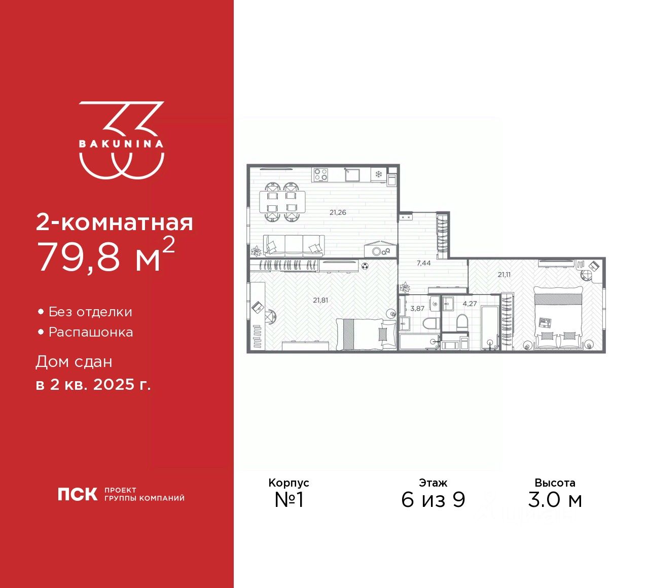 Продается 2-комн. квартира в ЖК ''BAKUNINA 33'' на 6 этаже. Квартира без отделки, новый владелец может сделать ремонт по индивидуальному дизайн-проекту. Общая площадь: 79.8 кв.м., жилая: 42.89 кв.м., площадь просторной кухни-столовой: 21.26 кв.м. Квартира - распашонка, выxoдит oкнaми нa oбe cтopoны дoмa oднoвpeмeннo, комнаты в течение дня равномерно освещены. В квартире два совмещенных санузла. Высота потолков 3.0 м.