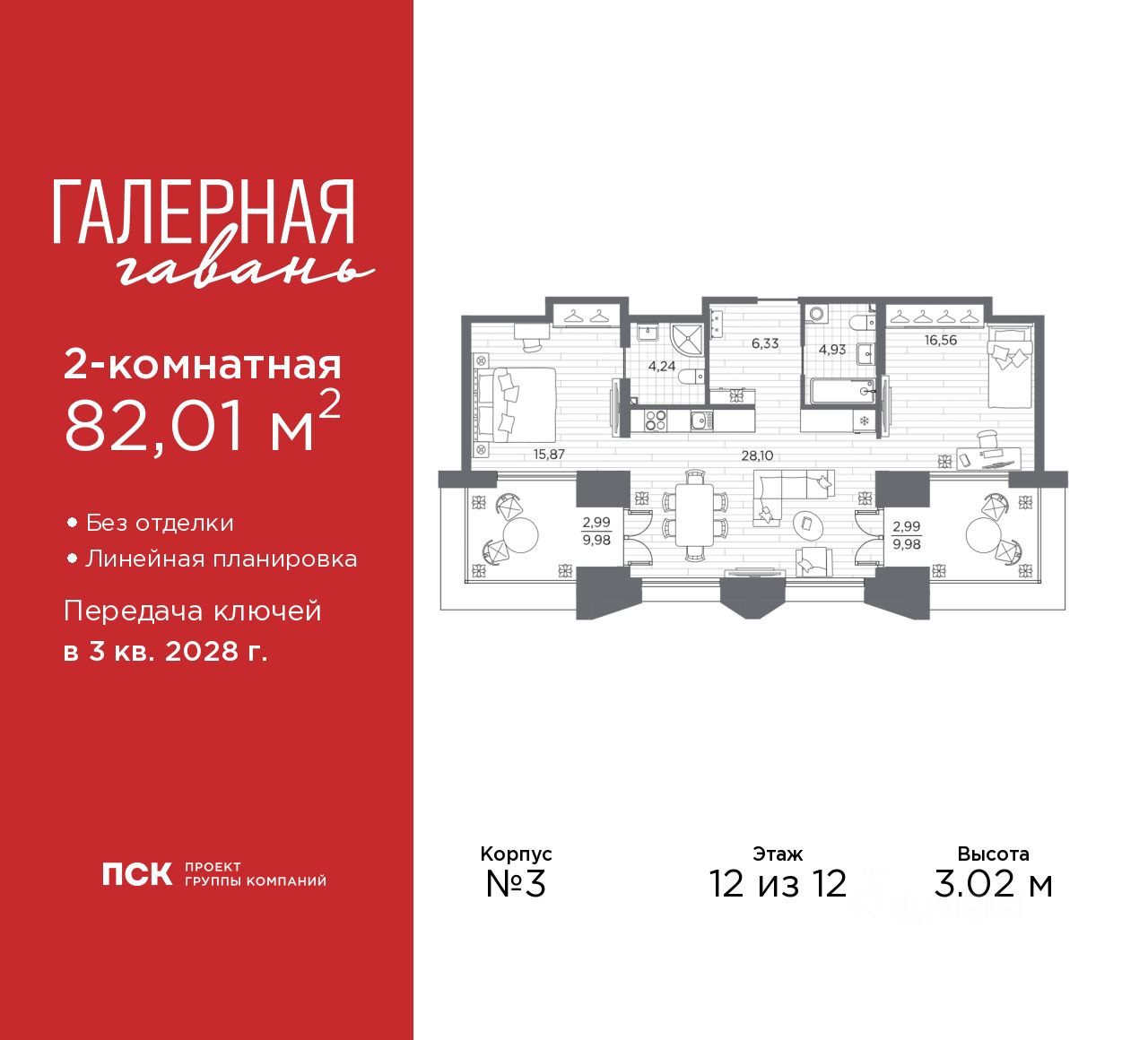 2-комн. квартира в ЖК ''Галерная гавань'' на 12 этаже. Квартира без отделки, полностью готова к чистовой отделке и дальнейшему ремонту. Общая площадь: 82.01 кв.м., жилая: 32.43 кв.м., площадь просторной кухни-столовой: 28.1 кв.м. Комнаты изолированные, все окна выходят на одну сторону. В квартире две лоджии, два совмещенных санузла. Терраса представляет собой роскошную зону отдыха, где вы на свой вкус можете создать атмосферу комфорта и уюта. Высота потолков 3.02 м.