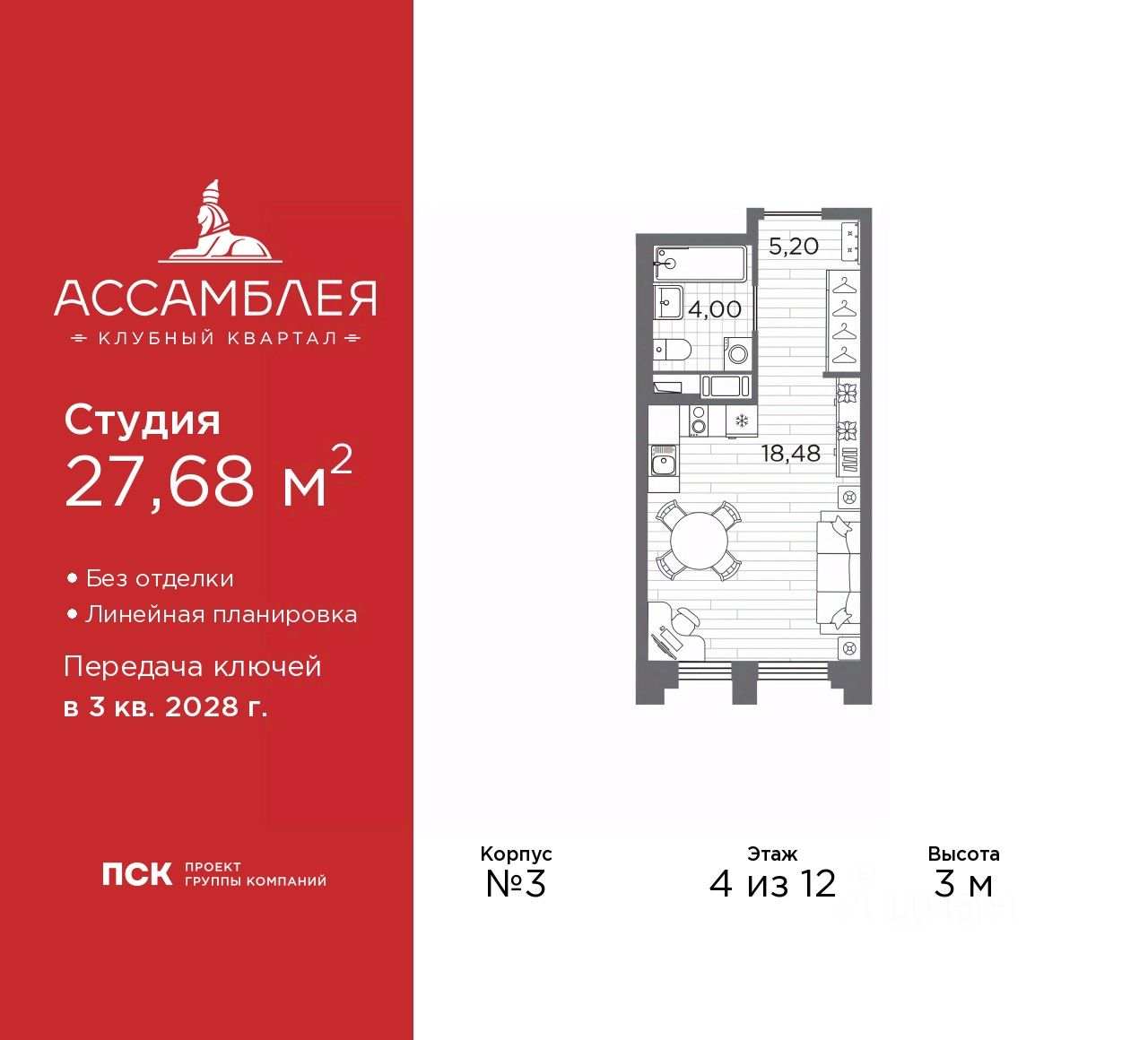 Просторная 1-комн. квартира-студия в Клубный квартал ''Ассамблея'' на 4 этаже. Квартира без отделки, полностью готова к чистовой отделке и дальнейшему ремонту. Общая площадь: 27.68 кв.м., площадь гостиной 18.48 кв.м., из которых 5 кв.м. выделено под кухонную зону. Все окна выходят на одну сторону. В квартире один совмещенный санузел. Высота потолков 3 м.