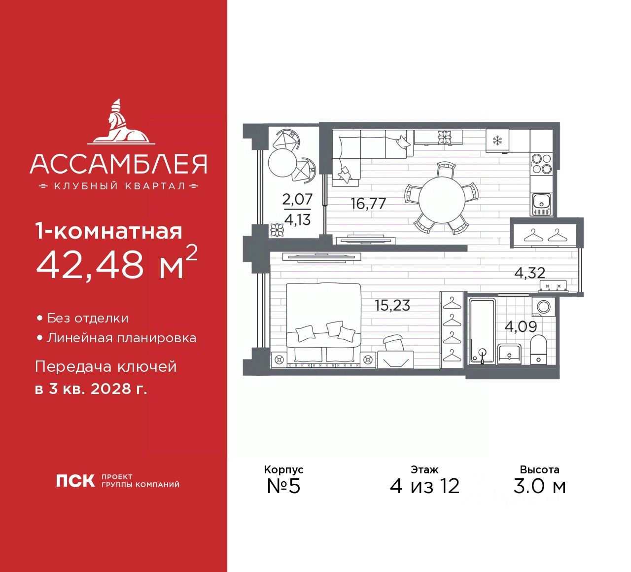 Просторная однокомнатная квартира в Клубный квартал ''Ассамблея'' на 4 этаже. Квартира без отделки, новый владелец может сделать ремонт по своему проекту. Общая площадь: 42.48 кв.м., жилая: 15.23 кв.м., площадь просторной кухни-столовой: 16.77 кв.м. Все окна выходят на одну сторону. В квартире одна лоджия, один совмещенный санузел. Высота потолков 3.0 м.