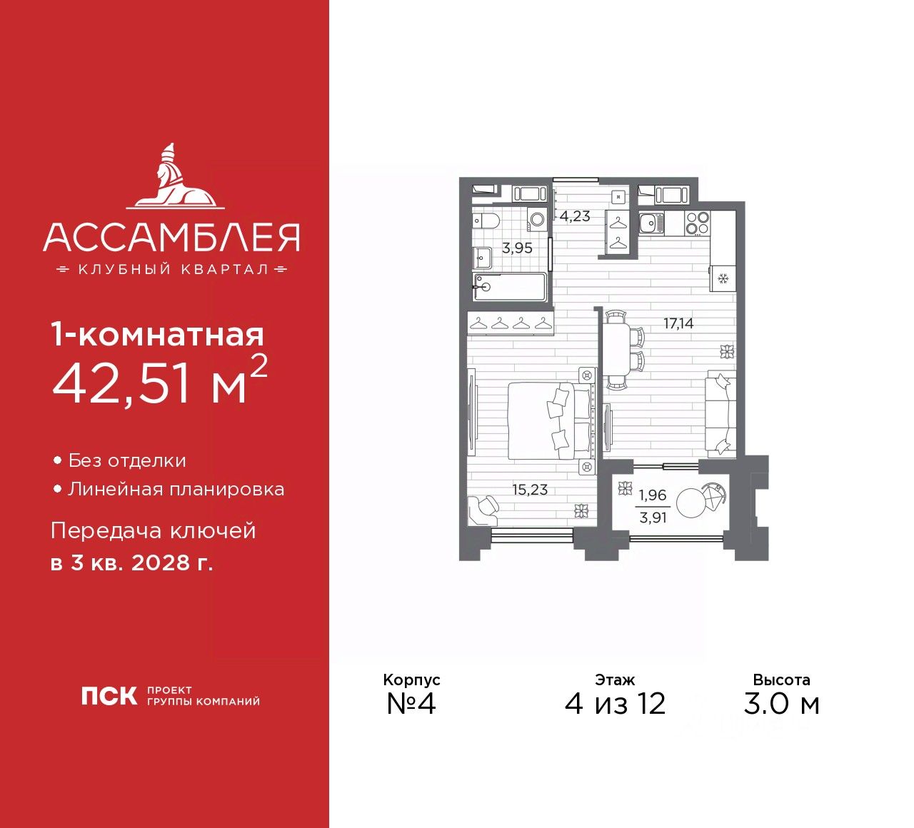 Просторная 1-комн. квартира в Клубный квартал ''Ассамблея'' на 4 этаже. Квартира без отделки, новый владелец может сделать ремонт по индивидуальному дизайн-проекту. Общая площадь: 42.51 кв.м., жилая: 15.23 кв.м., площадь просторной кухни-столовой: 17.14 кв.м. Все окна выходят на одну сторону. В квартире одна лоджия, один совмещенный санузел. Высота потолков 3.0 м.