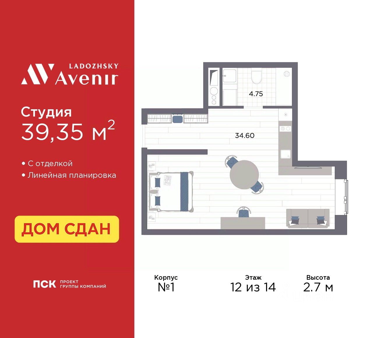 Продаются однокомнатные апартаменты-студия от застройщика с отделкой в ЖК ''Ladozhsky AVENIR'' на 12 этаже. Общая площадь: 39.35 кв.м., площадь гостиной 34.6 кв.м., из которых 5 кв.м. выделено под кухонную зону. Все окна выходят на одну сторону. В апартаментах один совмещенный санузел. Высота потолков 2.7 м.