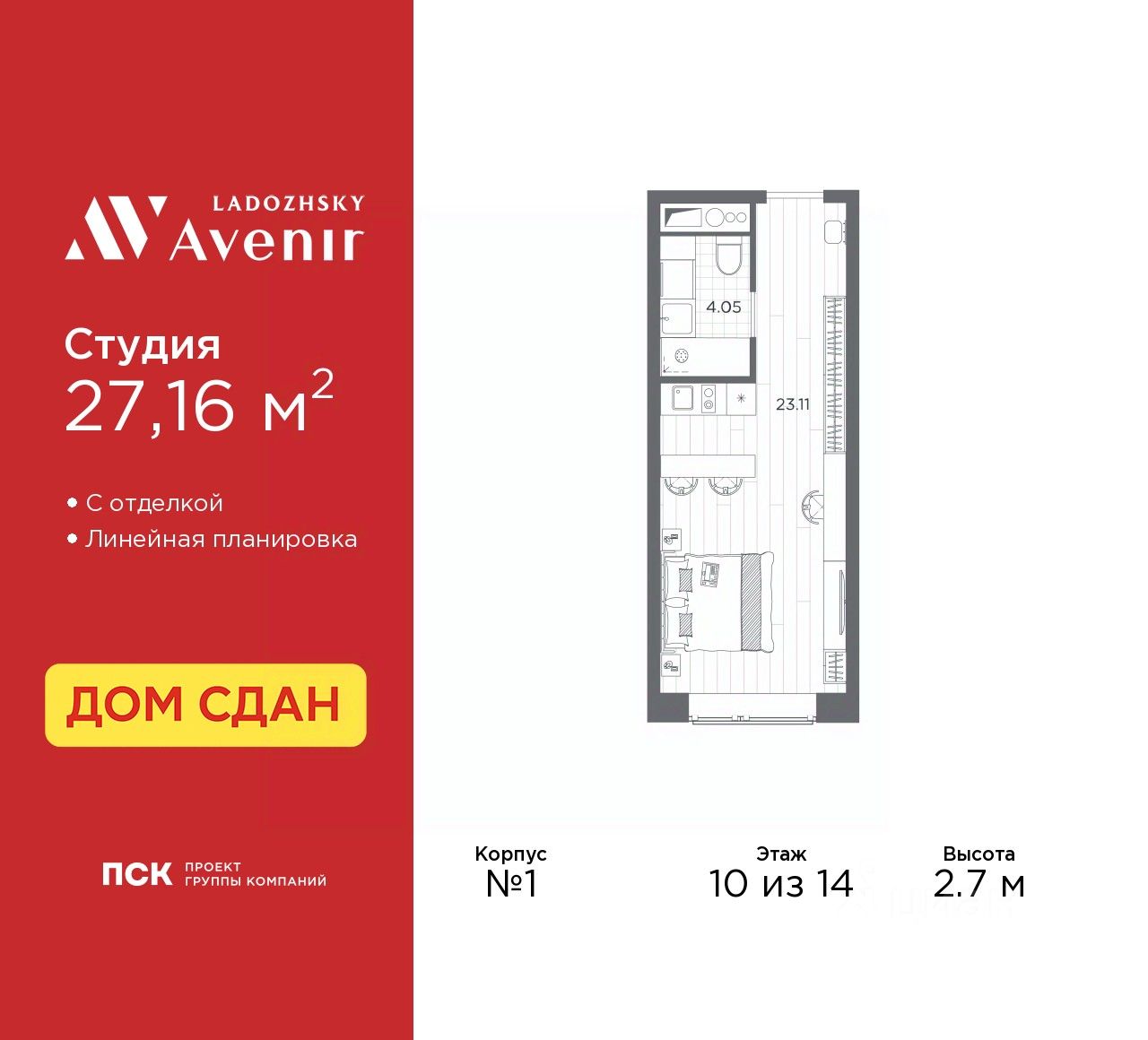 Однокомнатные апартаменты-студия от застройщика с отделкой в ЖК ''Ladozhsky AVENIR'' на 10 этаже. Общая площадь: 27.16 кв.м., площадь гостиной 23.11 кв.м., из которых 5 кв.м. выделено под кухонную зону. Все окна выходят на одну сторону. В апартаментах один совмещенный санузел. Высота потолков 2.7 м.