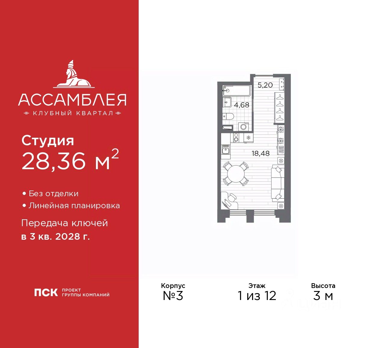 Просторная 1-комн. квартира-студия в Клубный квартал ''Ассамблея'' на 1 этаже. Квартира без отделки, полностью готова к ремонту. Общая площадь: 28.36 кв.м., площадь гостиной 18.48 кв.м., из которых 5 кв.м. выделено под кухонную зону. Все окна выходят на одну сторону. В квартире один совмещенный санузел. Высота потолков 3 м.