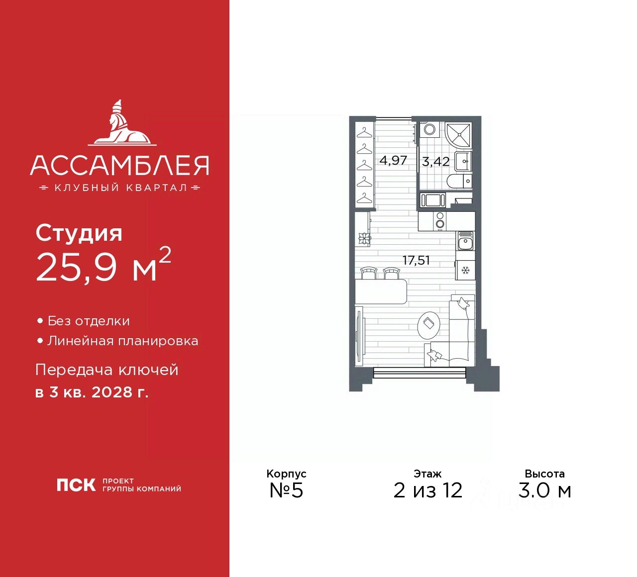 Однокомнатная квартира-студия в Клубный квартал ''Ассамблея'' на 2 этаже. Квартира без отделки, полностью готова к чистовой отделке и дальнейшему ремонту. Общая площадь: 25.9 кв.м., площадь гостиной 17.51 кв.м., из которых 5 кв.м. выделено под кухонную зону. Все окна выходят на одну сторону. В квартире один совмещенный санузел. Высота потолков 3.0 м.
