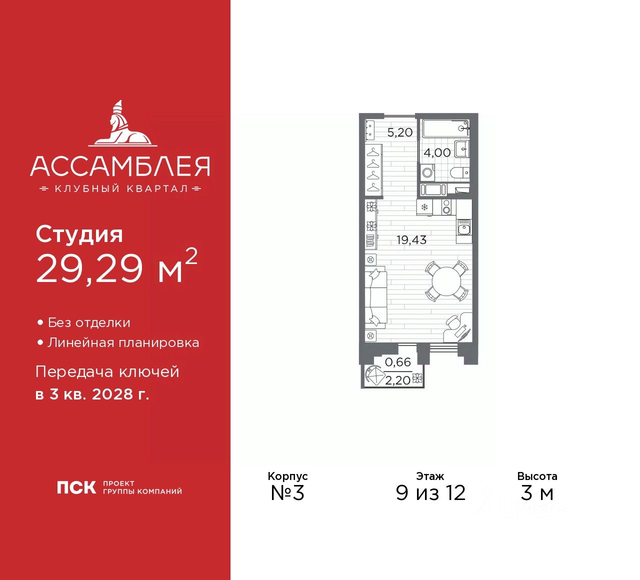 Просторная однокомнатная квартира-студия в Клубный квартал ''Ассамблея'' на 9 этаже. Квартира без отделки, полностью готова к ремонту. Общая площадь: 29.29 кв.м., площадь гостиной 19.43 кв.м., из которых 5 кв.м. выделено под кухонную зону. Все окна выходят на одну сторону. В квартире один балкон, один совмещенный санузел. Высота потолков 3 м.