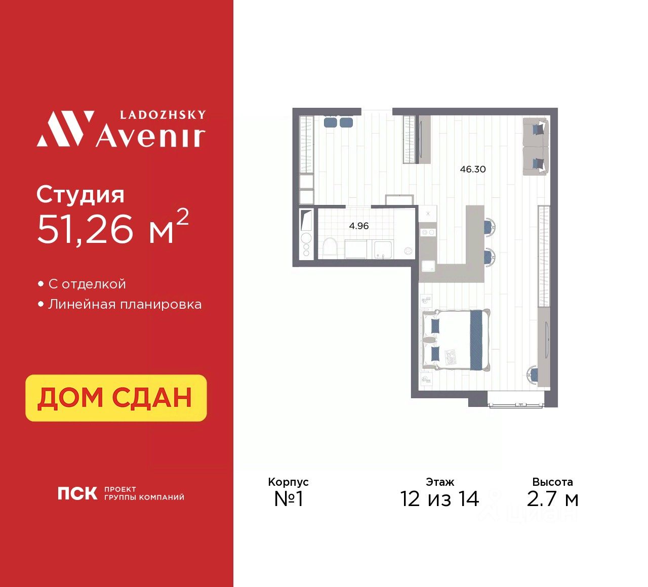 1-комн. апартаменты-студия с отделкой в ЖК ''Ladozhsky AVENIR'' на 12 этаже. Общая площадь: 51.26 кв.м., площадь гостиной 46.3 кв.м., из которых 10 кв.м. выделено под кухонную зону. Все окна выходят на одну сторону. В апартаментах один совмещенный санузел. Высота потолков 2.7 м.