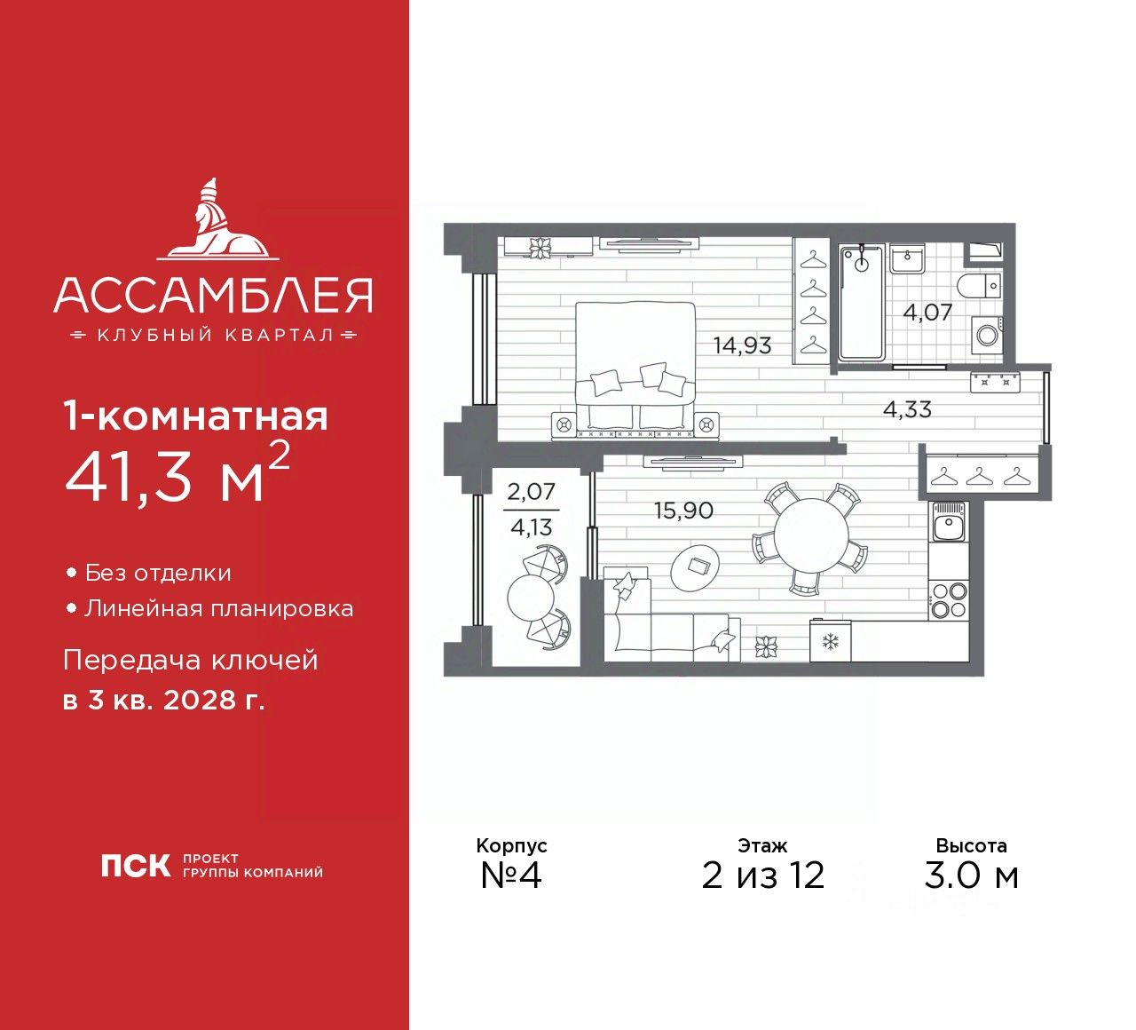 Просторная однокомнатная квартира в Клубный квартал ''Ассамблея'' на 2 этаже. Квартира без отделки, полностью готова к чистовой отделке и дальнейшему ремонту. Общая площадь: 41.3 кв.м., жилая: 14.93 кв.м., площадь просторной кухни-столовой: 15.9 кв.м. Все окна выходят на одну сторону. В квартире одна лоджия, один совмещенный санузел. Высота потолков 3.0 м.