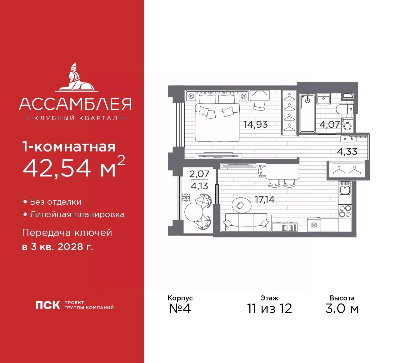 Продается 1-комн. квартира в Клубный квартал ''Ассамблея'' на 11 этаже. Квартира без отделки, полностью готова к ремонту. Общая площадь: 42.54 кв.м., жилая: 14.93 кв.м., площадь просторной кухни-столовой: 17.14 кв.м. Все окна выходят на одну сторону. В квартире одна лоджия, один совмещенный санузел. Высота потолков 3.0 м.