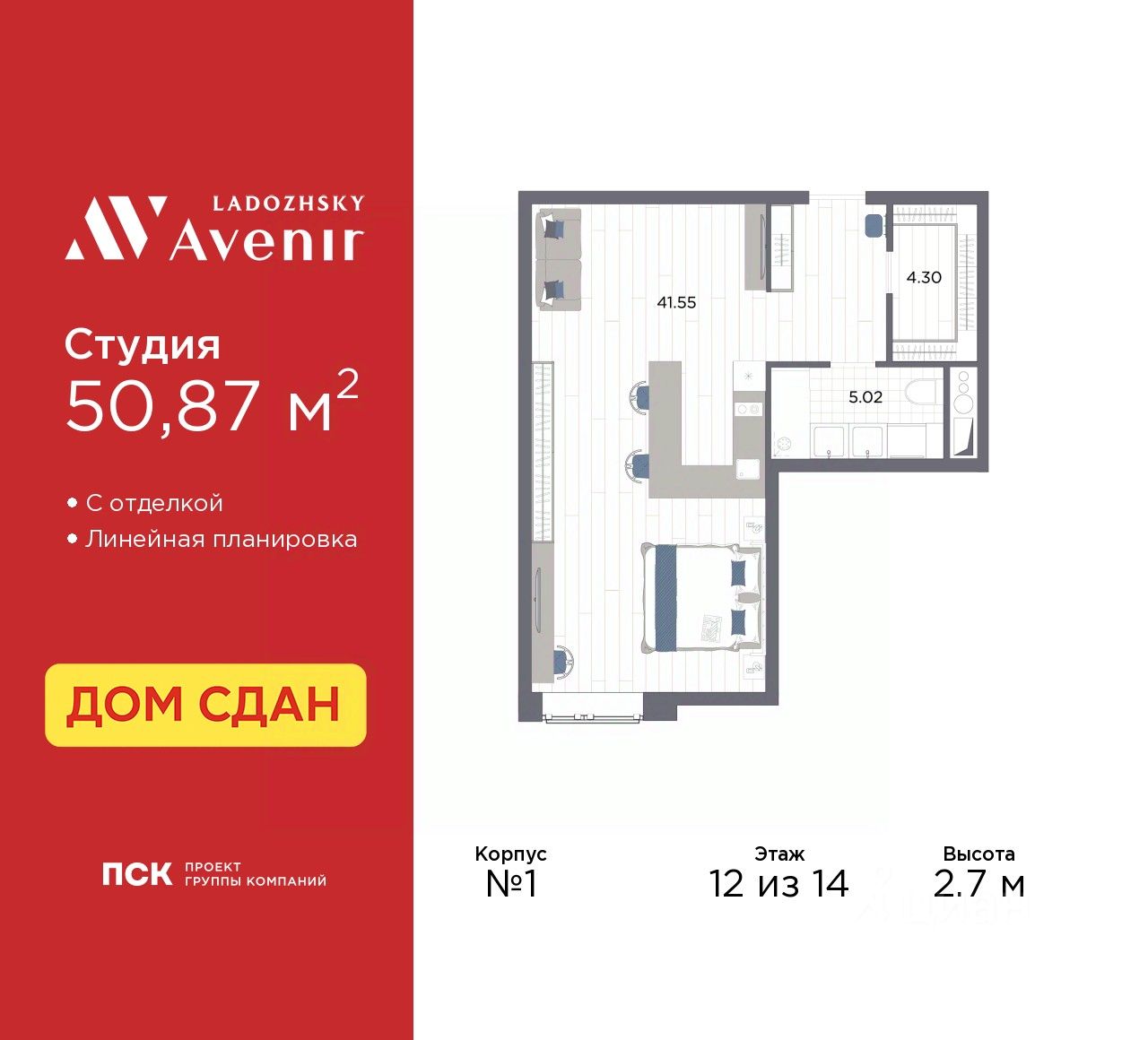 1-комн. апартаменты-студия с отделкой в ЖК ''Ladozhsky AVENIR'' на 12 этаже. Общая площадь: 50.87 кв.м., площадь гостиной 41.55 кв.м., из которых 10 кв.м. выделено под кухонную зону. Все окна выходят на одну сторону. В апартаментах один совмещенный санузел. Высота потолков 2.7 м.