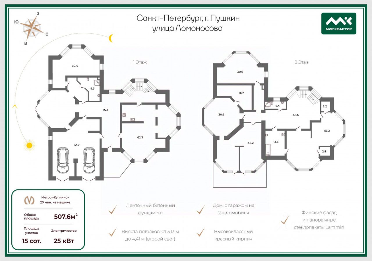 Дом: 508 м² на двух этажах, с гаражом на 2 машиноместа. Участок 15 соток.