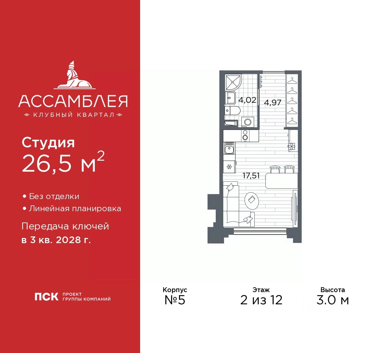 Просторная однокомнатная квартира-студия в Клубный квартал ''Ассамблея'' на 2 этаже. Квартира без отделки, после оформления собственности можно делать ремонт. Общая площадь: 26.5 кв.м., площадь гостиной 17.51 кв.м., из которых 5 кв.м. выделено под кухонную зону. Все окна выходят на одну сторону. В квартире один совмещенный санузел. Высота потолков 3.0 м.