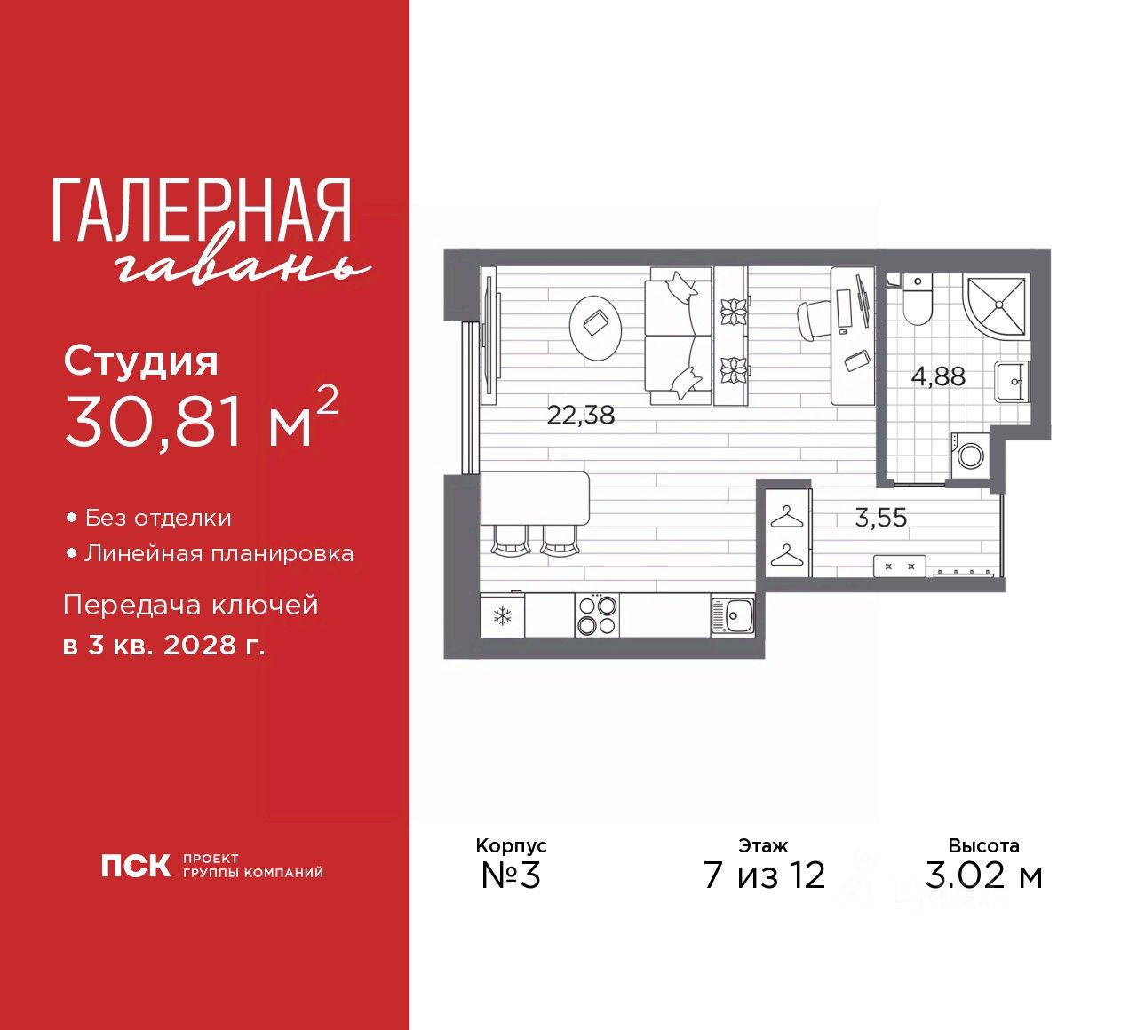 Просторная 1-комн. квартира-студия в ЖК ''Галерная гавань'' на 7 этаже. Квартира без отделки, полностью готова к чистовой отделке и дальнейшему ремонту. Общая площадь: 30.81 кв.м., площадь гостиной 22.38 кв.м., из которых 5 кв.м. выделено под кухонную зону. Все окна выходят на одну сторону. В квартире один совмещенный санузел. Высота потолков 3.02 м.