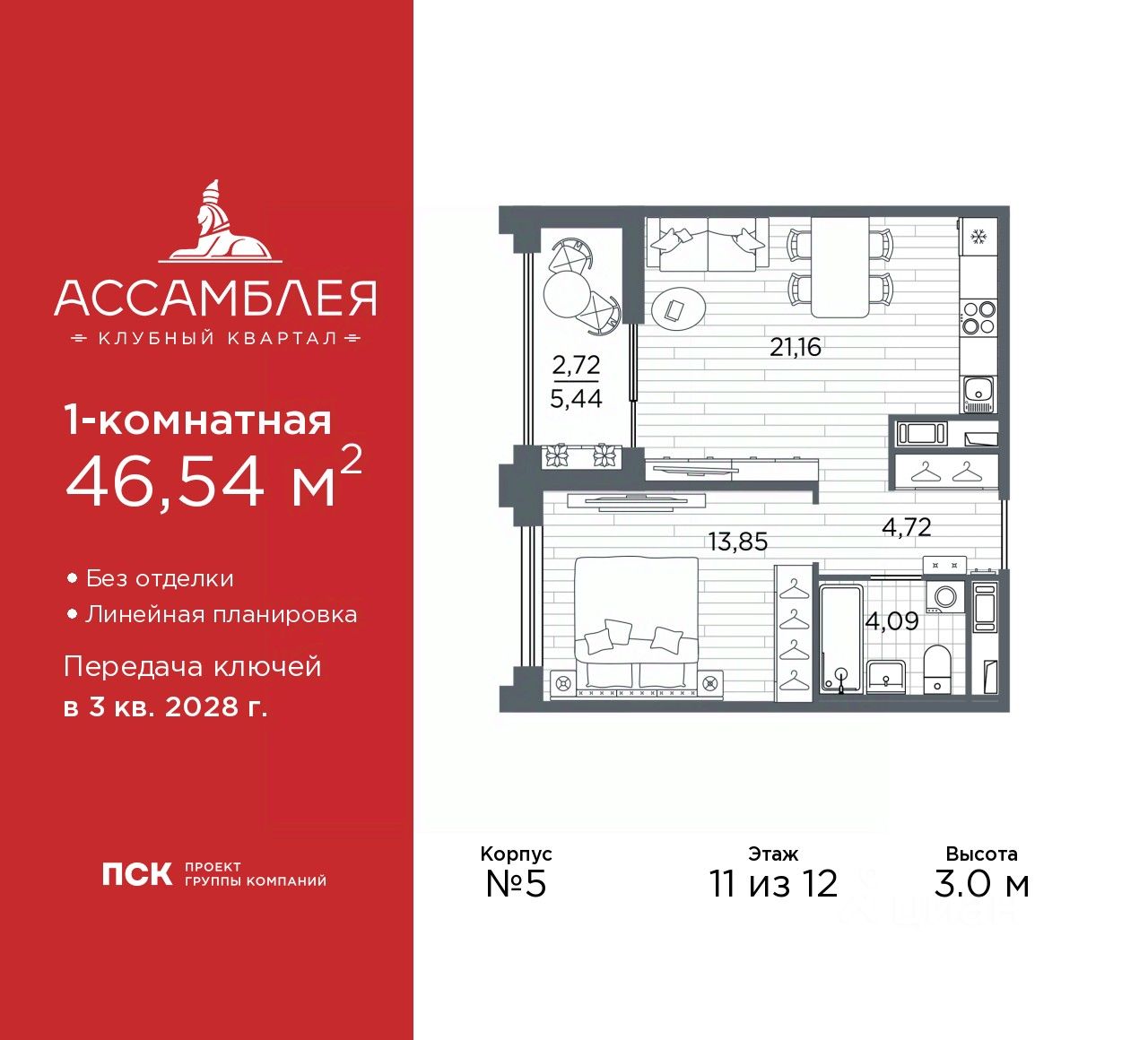 Продается однокомнатная квартира в Клубный квартал ''Ассамблея'' на 11 этаже. Квартира без отделки, новый владелец может сделать ремонт по индивидуальному проекту. Общая площадь: 46.54 кв.м., жилая: 13.85 кв.м., площадь просторной кухни-столовой: 21.16 кв.м. Все окна выходят на одну сторону. В квартире одна лоджия, один совмещенный санузел. Высота потолков 3.0 м.