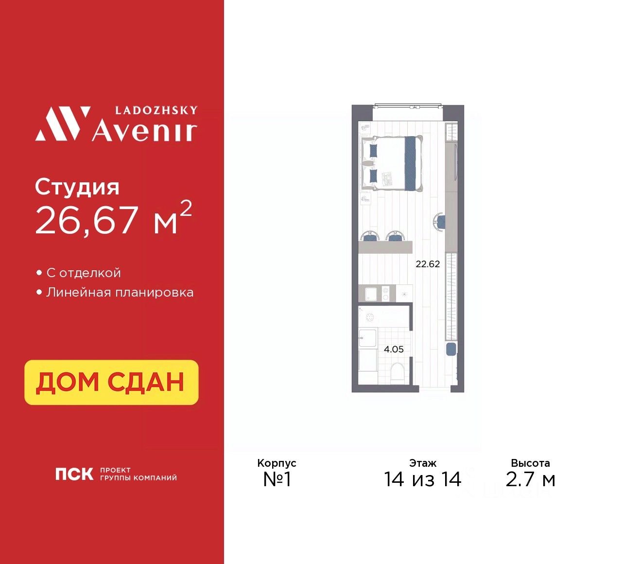 Продаются однокомнатные апартаменты-студия с отделкой в ЖК ''Ladozhsky AVENIR'' на 14 этаже. Общая площадь: 26.67 кв.м., площадь гостиной 22.62 кв.м., из которых 5 кв.м. выделено под кухонную зону. Все окна выходят на одну сторону. В апартаментах один совмещенный санузел. Высота потолков 2.7 м.