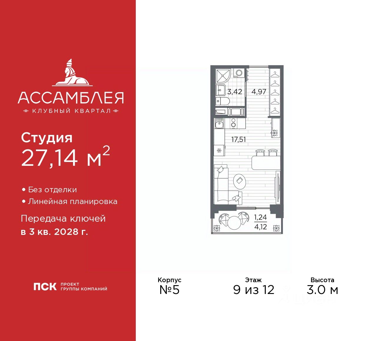 Однокомнатная квартира-студия в Клубный квартал ''Ассамблея'' на 9 этаже. Квартира без отделки, новый собственник может сделать ремонт по своему проекту. Общая площадь: 27.14 кв.м., площадь гостиной 17.51 кв.м., из которых 5 кв.м. выделено под кухонную зону. Все окна выходят на одну сторону. В квартире один балкон, один совмещенный санузел. Высота потолков 3.0 м.