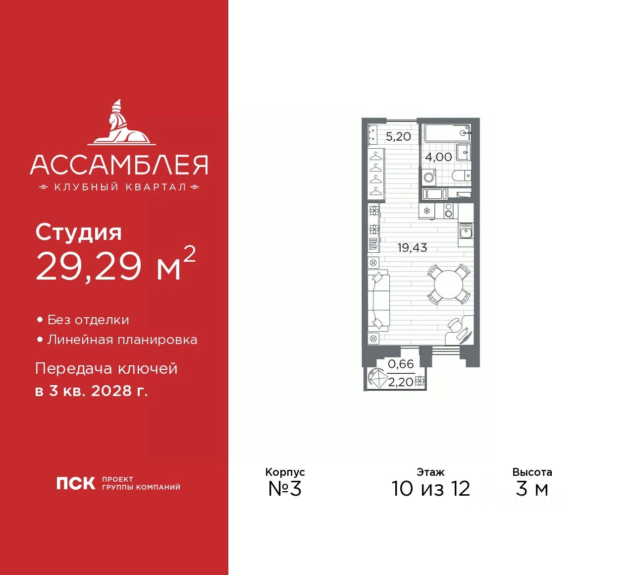 Однокомнатная квартира-студия в Клубный квартал ''Ассамблея'' на 10 этаже. Квартира без отделки, полностью готова к ремонту. Общая площадь: 29.29 кв.м., площадь гостиной 19.43 кв.м., из которых 5 кв.м. выделено под кухонную зону. Все окна выходят на одну сторону. В квартире один балкон, один совмещенный санузел. Высота потолков 3 м.