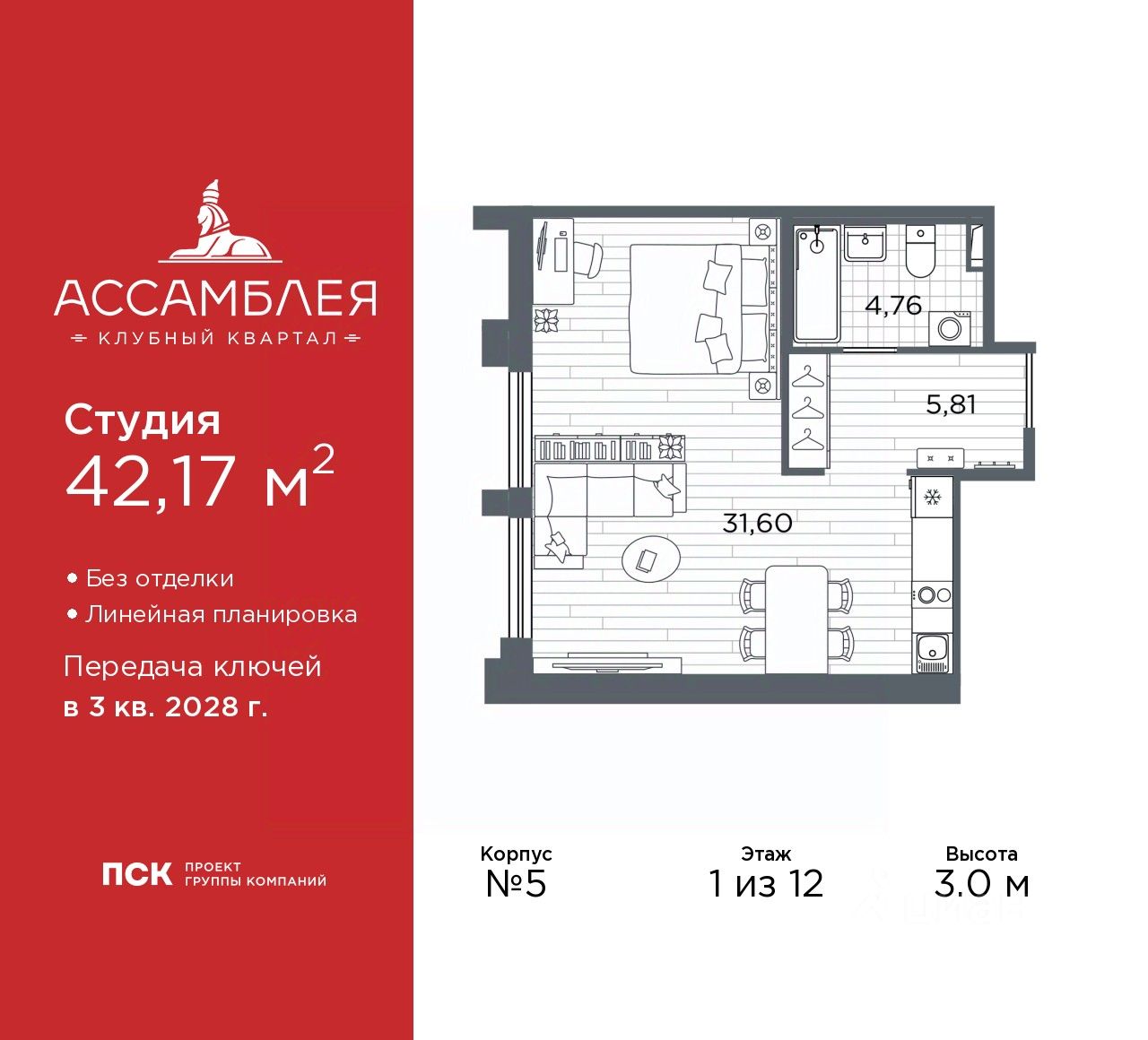 Однокомнатная квартира-студия в Клубный квартал ''Ассамблея'' на 1 этаже. Квартира без отделки, после оформления собственности можно делать ремонт. Общая площадь: 42.17 кв.м., площадь гостиной 31.6 кв.м., из которых 10 кв.м. выделено под кухонную зону. Все окна выходят на одну сторону. В квартире один совмещенный санузел. Высота потолков 3.0 м.