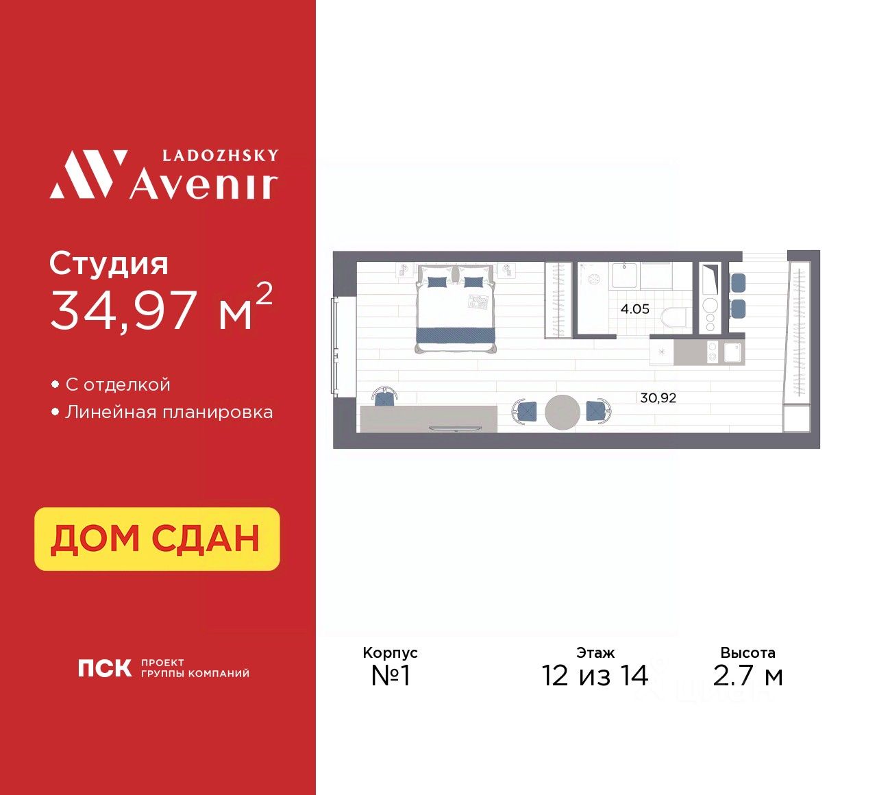 Однокомнатные апартаменты-студия с отделкой в ЖК ''Ladozhsky AVENIR'' на 12 этаже. Общая площадь: 34.97 кв.м., площадь гостиной 30.92 кв.м., из которых 5 кв.м. выделено под кухонную зону. Все окна выходят на одну сторону. В апартаментах один совмещенный санузел. Высота потолков 2.7 м.