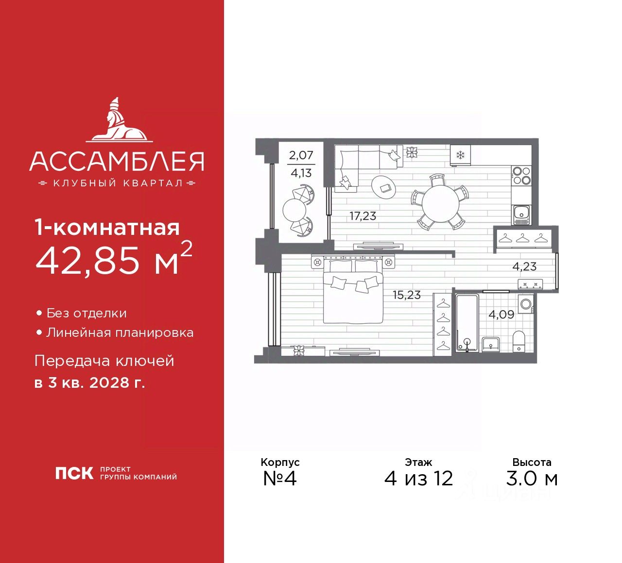 Продается 1-комн. квартира в Клубный квартал ''Ассамблея'' на 4 этаже. Квартира без отделки, новый владелец может сделать ремонт по своему проекту. Общая площадь: 42.85 кв.м., жилая: 15.23 кв.м., площадь просторной кухни-столовой: 17.23 кв.м. Все окна выходят на одну сторону. В квартире одна лоджия, один совмещенный санузел. Высота потолков 3.0 м.