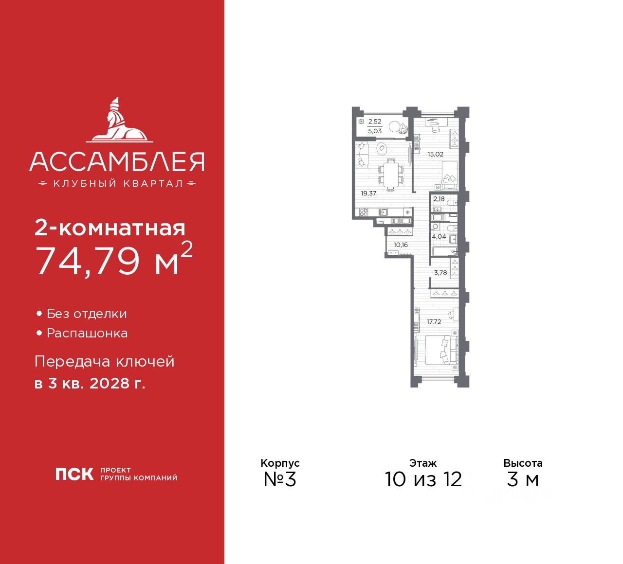 Просторная 2-комн. квартира в Клубный квартал ''Ассамблея'' на 10 этаже. Квартира без отделки, после получения ключей можно делать ремонт. Общая площадь: 74.79 кв.м., жилая: 32.74 кв.м., площадь просторной кухни-столовой: 19.37 кв.м. Квартира - распашонка, без проходных комнат, окна выходят на paзные стороны дома. В квартире одна лоджия, один совмещенный и один раздельный санузел. Высота потолков 3 м.