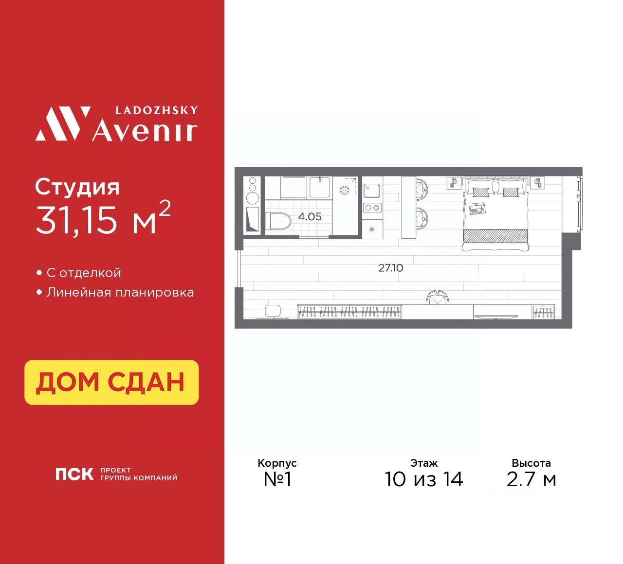 Просторные 1-комн. апартаменты-студия с отделкой в ЖК ''Ladozhsky AVENIR'' на 10 этаже. Общая площадь: 31.15 кв.м., площадь гостиной 27.1 кв.м., из которых 5 кв.м. выделено под кухонную зону. Все окна выходят на одну сторону. В апартаментах один совмещенный санузел. Высота потолков 2.7 м.