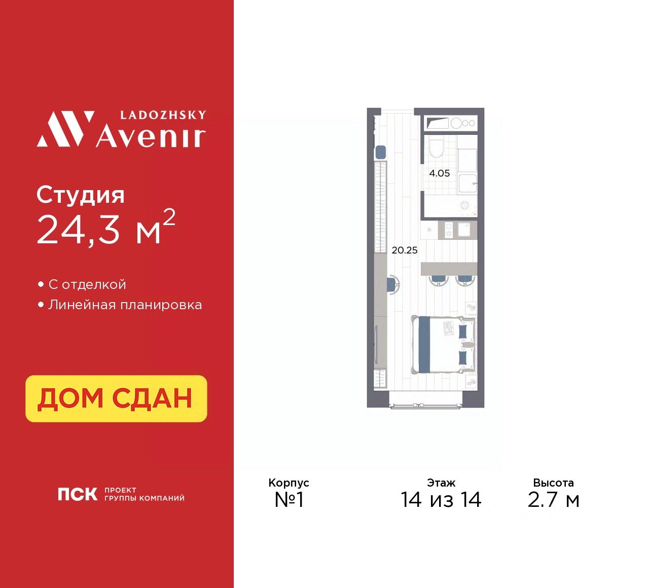 Продаются однокомнатные апартаменты-студия с отделкой в ЖК ''Ladozhsky AVENIR'' на 14 этаже. Общая площадь: 24.3 кв.м., площадь гостиной 20.25 кв.м., из которых 5 кв.м. выделено под кухонную зону. Все окна выходят на одну сторону. В апартаментах один совмещенный санузел. Высота потолков 2.7 м.