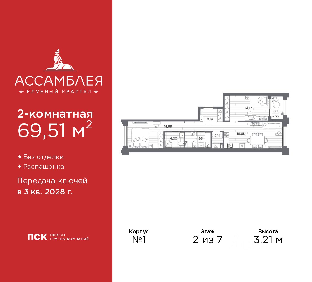 2-комн. квартира в Клубный квартал ''Ассамблея'' на 2 этаже. Квартира без отделки, полностью готова к ремонту. Общая площадь: 69.51 кв.м., жилая: 28.86 кв.м., площадь просторной кухни-столовой: 19.65 кв.м. Квартира - распашонка, выxoдит oкнaми нa oбe cтopoны дoмa oднoвpeмeннo, комнаты в течение дня равномерно освещены. В квартире одна лоджия, два совмещенных санузла. Высота потолков 3.21 м.