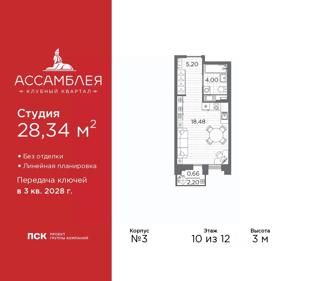 Продается 1-комн. квартира-студия от застройщика в Клубный квартал ''Ассамблея'' на 10 этаже. Квартира без отделки, после оформления собственности можно делать ремонт. Общая площадь: 28.34 кв.м., площадь гостиной 18.48 кв.м., из которых 5 кв.м. выделено под кухонную зону. Все окна выходят на одну сторону. В квартире один балкон, один совмещенный санузел. Высота потолков 3 м.