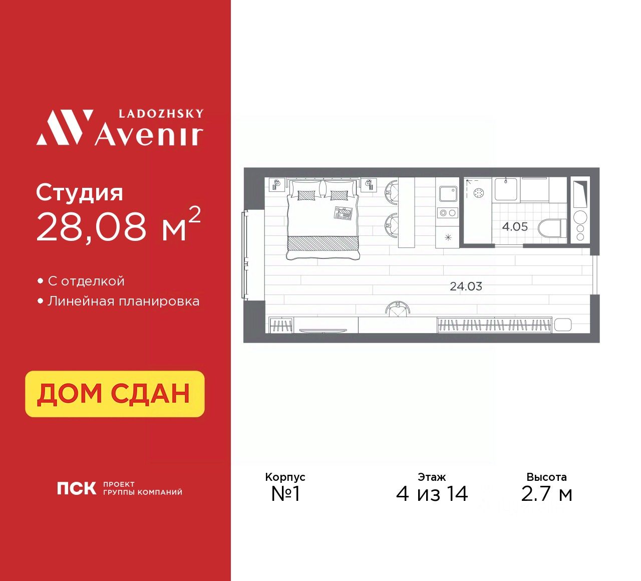 Продаются однокомнатные апартаменты-студия с отделкой в ЖК ''Ladozhsky AVENIR'' на 4 этаже. Общая площадь: 28.08 кв.м., площадь гостиной 24.03 кв.м., из которых 5 кв.м. выделено под кухонную зону. Все окна выходят на одну сторону. В апартаментах один совмещенный санузел. Высота потолков 2.7 м.