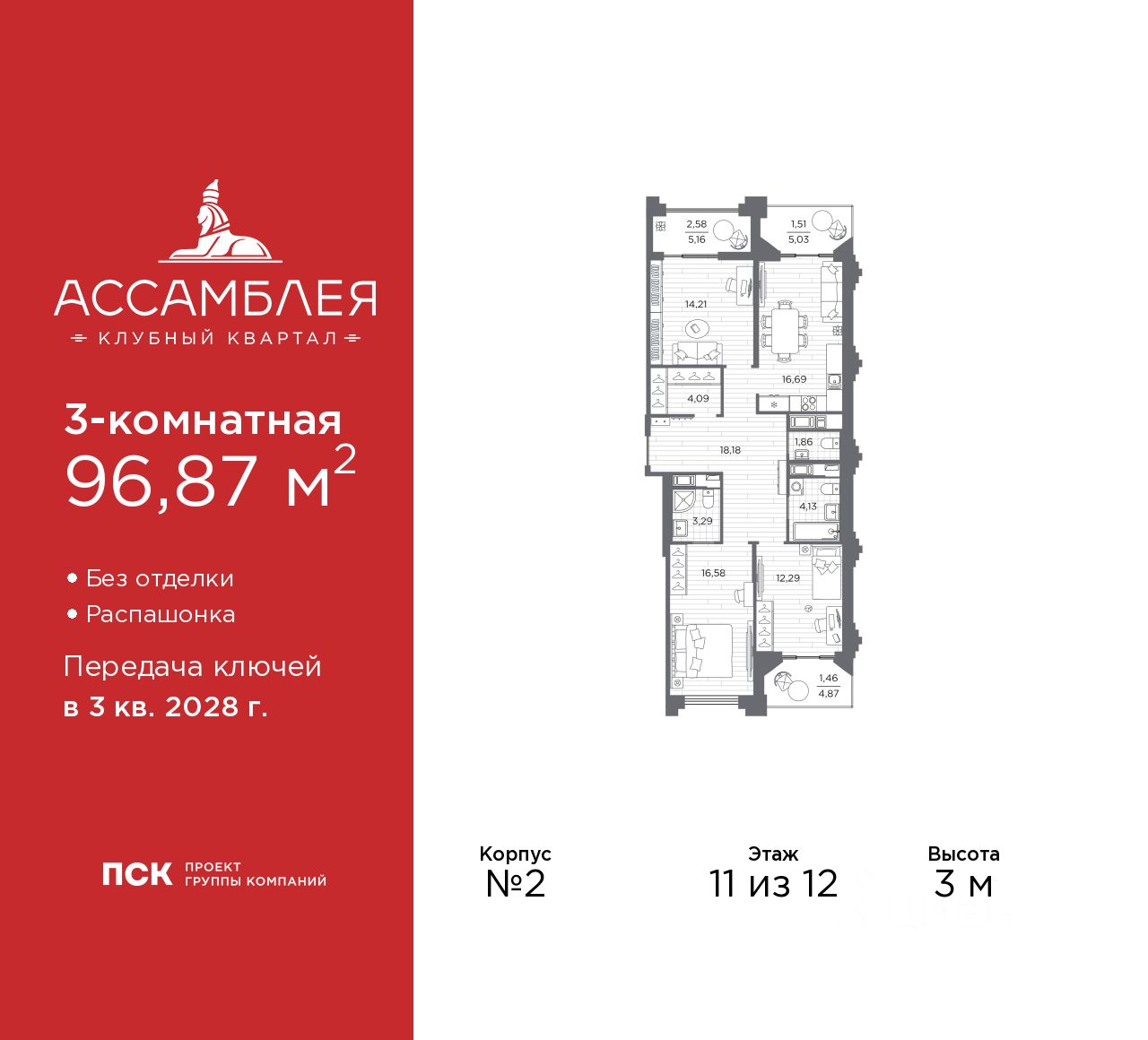 3-комн. квартира в Клубный квартал ''Ассамблея'' на 11 этаже. Квартира без отделки, полностью готова к ремонту. Общая площадь: 96.87 кв.м., жилая: 43.08 кв.м., площадь просторной кухни-столовой: 16.69 кв.м. Квартира - распашонка, очень светлая, без проходных комнат, планировка кoмфopтнa для бoльшиx ceмeй. В квартире два балкона и одна лоджия, два совмещенных и один раздельный санузел. Высота потолков 3 м.