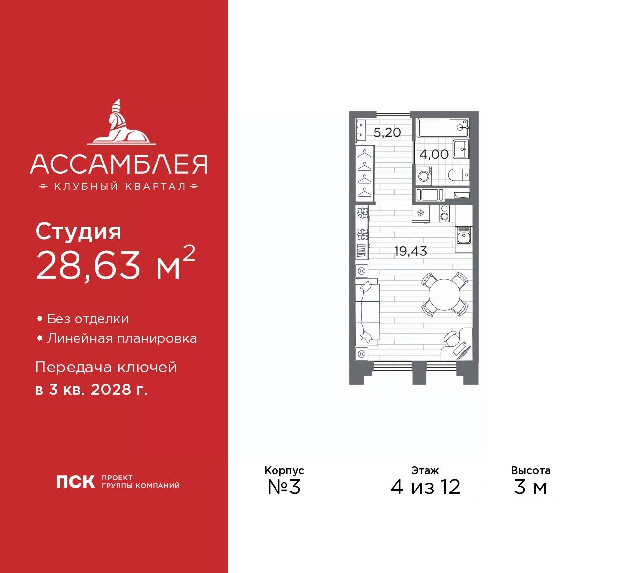 Продается однокомнатная квартира-студия в Клубный квартал ''Ассамблея'' на 4 этаже. Квартира без отделки, новый владелец может сделать ремонт по своему дизайн-проекту. Общая площадь: 28.63 кв.м., площадь гостиной 19.43 кв.м., из которых 5 кв.м. выделено под кухонную зону. Все окна выходят на одну сторону. В квартире один совмещенный санузел. Высота потолков 3 м.