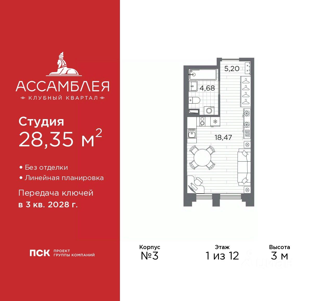 1-комн. квартира-студия от застройщика в Клубный квартал ''Ассамблея'' на 1 этаже. Квартира без отделки, после получения ключей можно делать ремонт. Общая площадь: 28.35 кв.м., площадь гостиной 18.47 кв.м., из которых 5 кв.м. выделено под кухонную зону. Все окна выходят на одну сторону. В квартире один совмещенный санузел. Высота потолков 3 м.