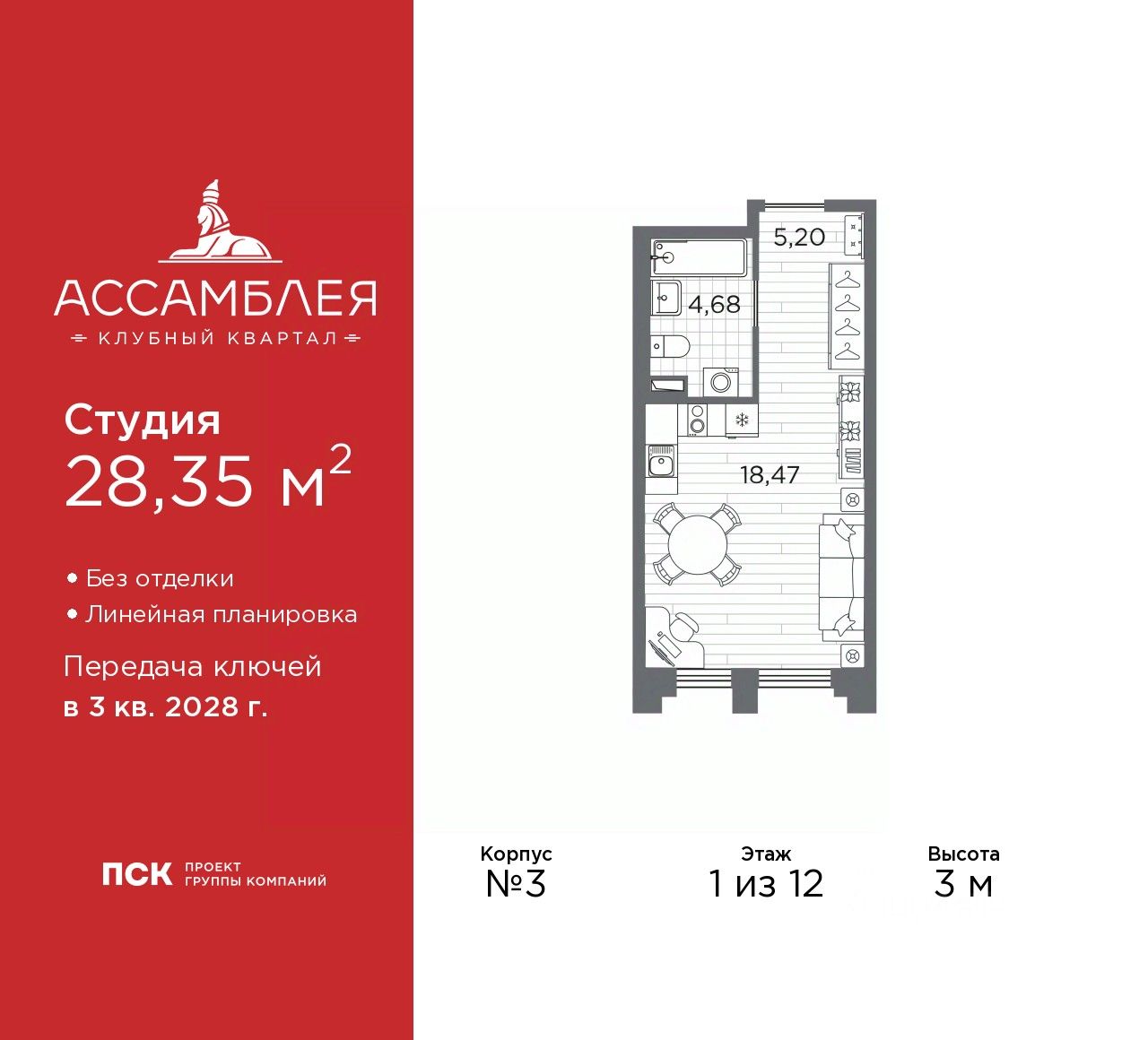 1-комн. квартира-студия от застройщика в Клубный квартал ''Ассамблея'' на 1 этаже. Квартира без отделки, после выдачи ключей можно делать ремонт. Общая площадь: 28.35 кв.м., площадь гостиной 18.47 кв.м., из которых 5 кв.м. выделено под кухонную зону. Все окна выходят на одну сторону. В квартире один совмещенный санузел. Высота потолков 3 м.