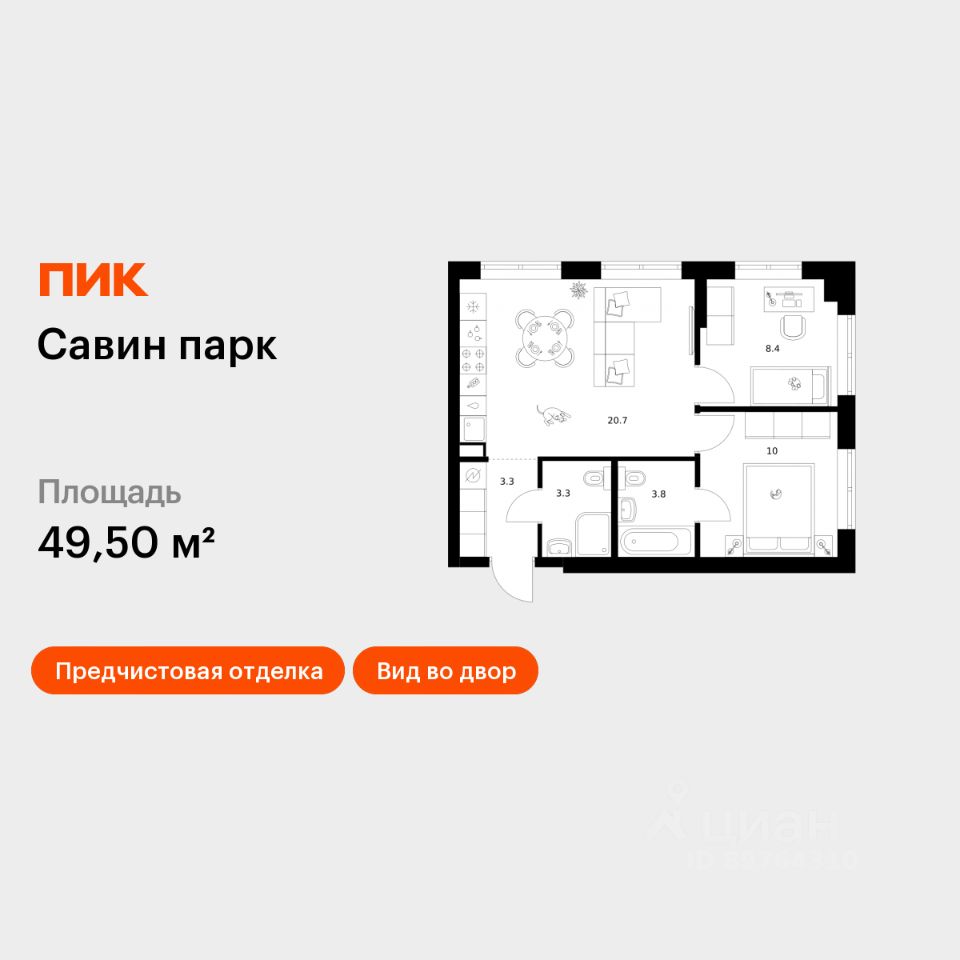 Продаётся 2-комн. квартира площадью 49,5 кв.м на 1 этаже 17 этажного дома (Корпус 9, Секция 1) проекта ПИК Савин парк. Светлый просторный подъезд на уровне земли, функциональная планировка, большие окна, предчистовая отделка.